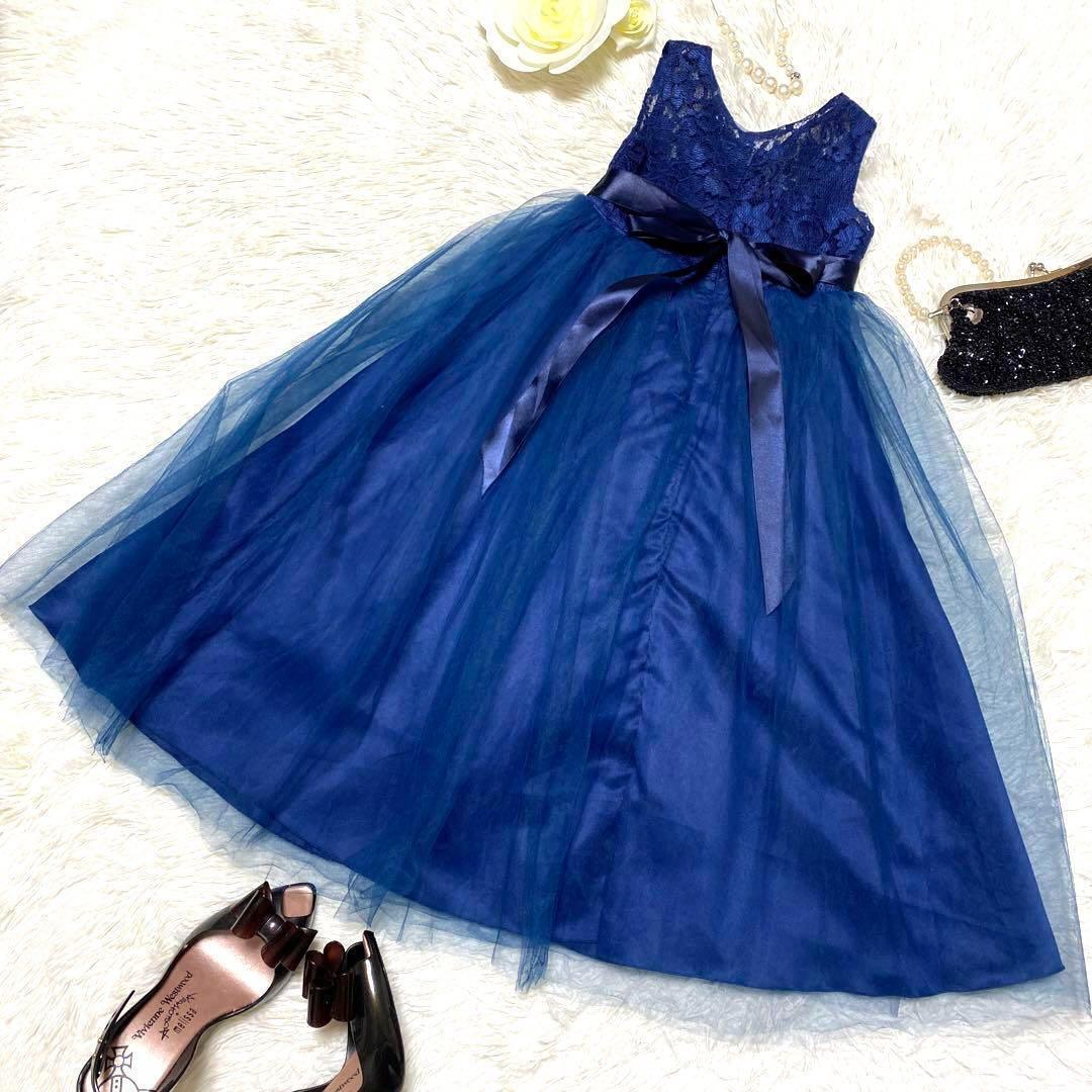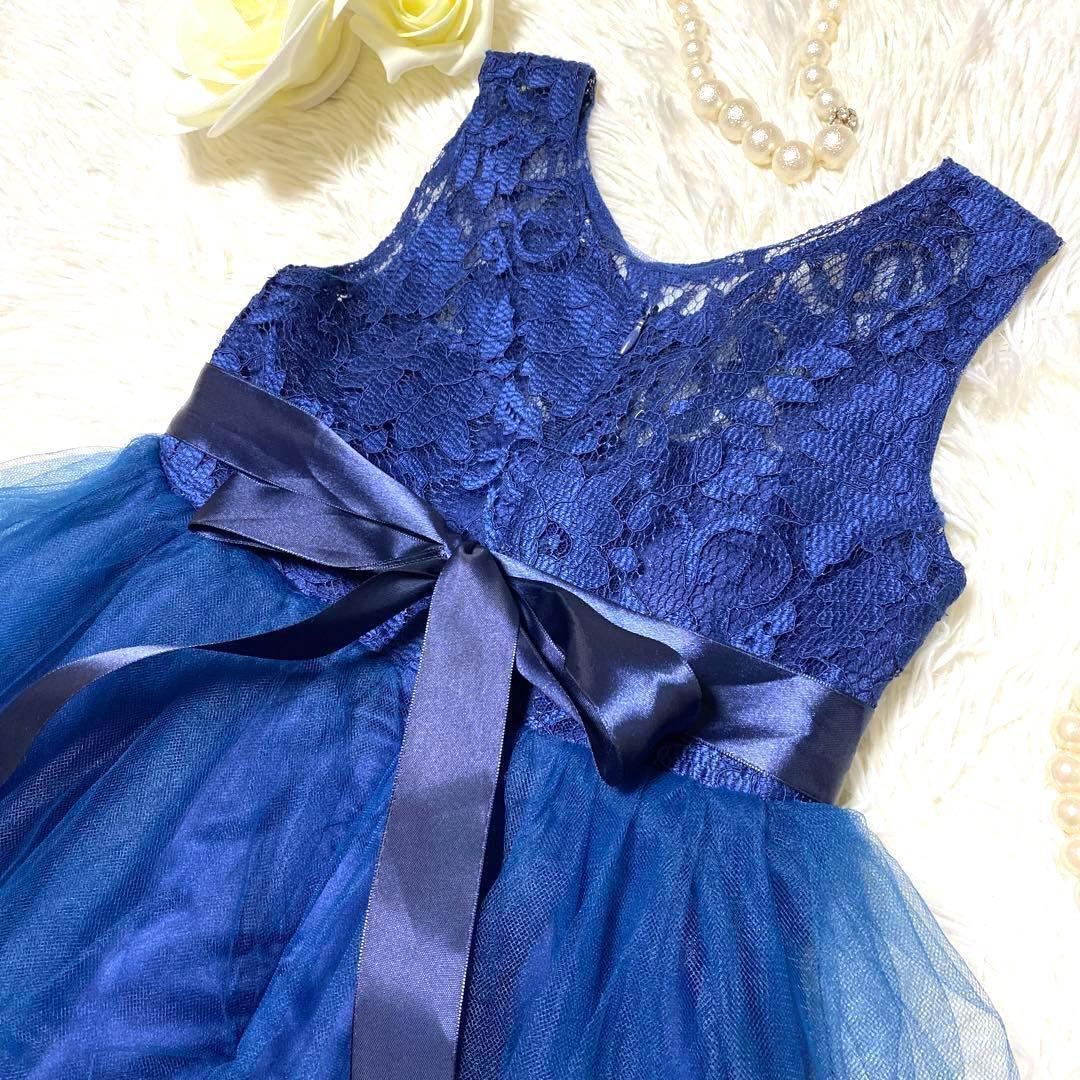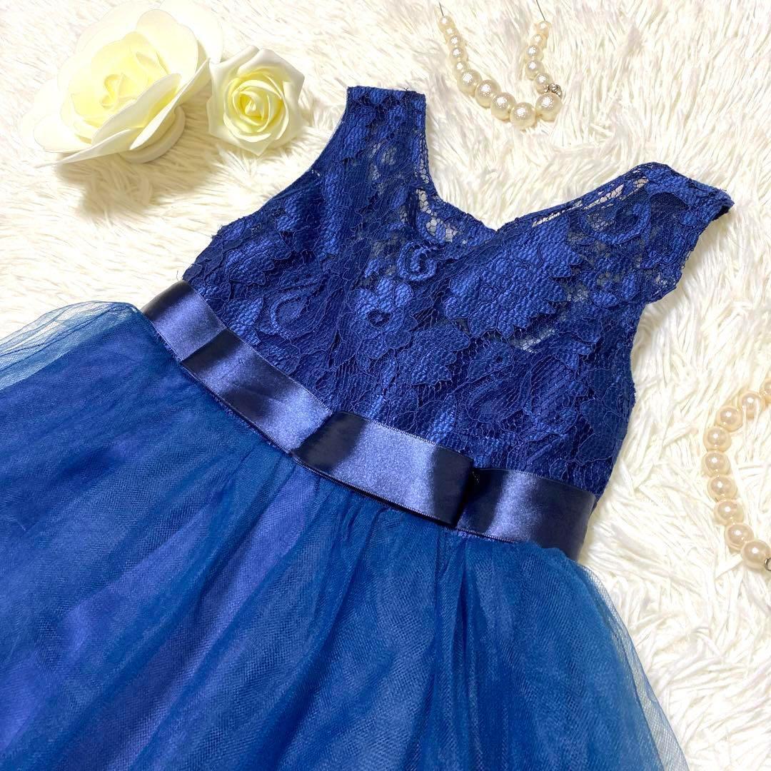 キッズパーティドレス レース チュール フレア リボン 可愛い 発表会 結婚式 ネイビー キッズ 120