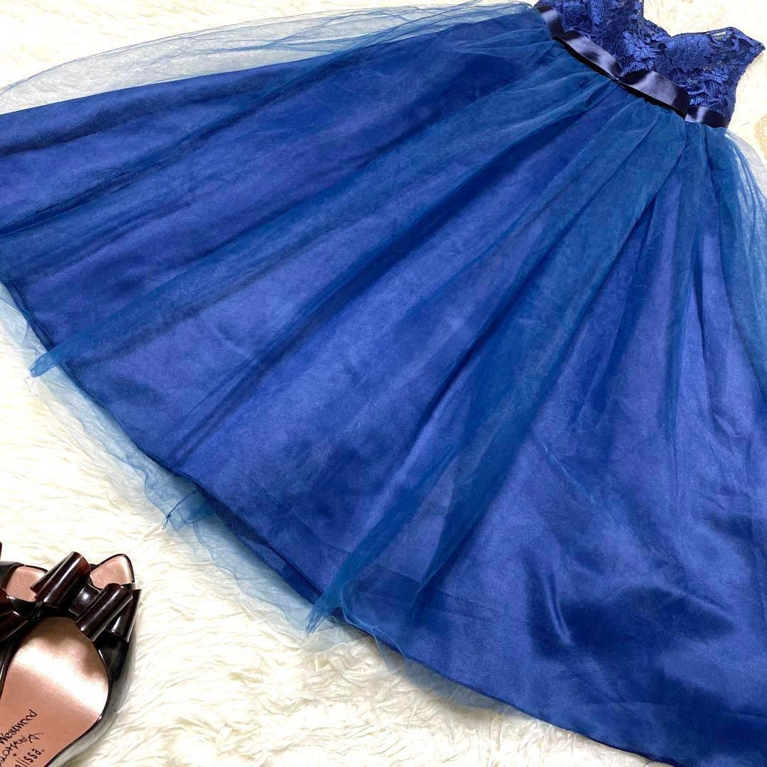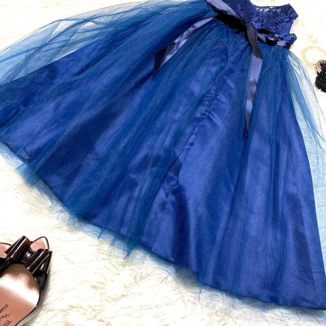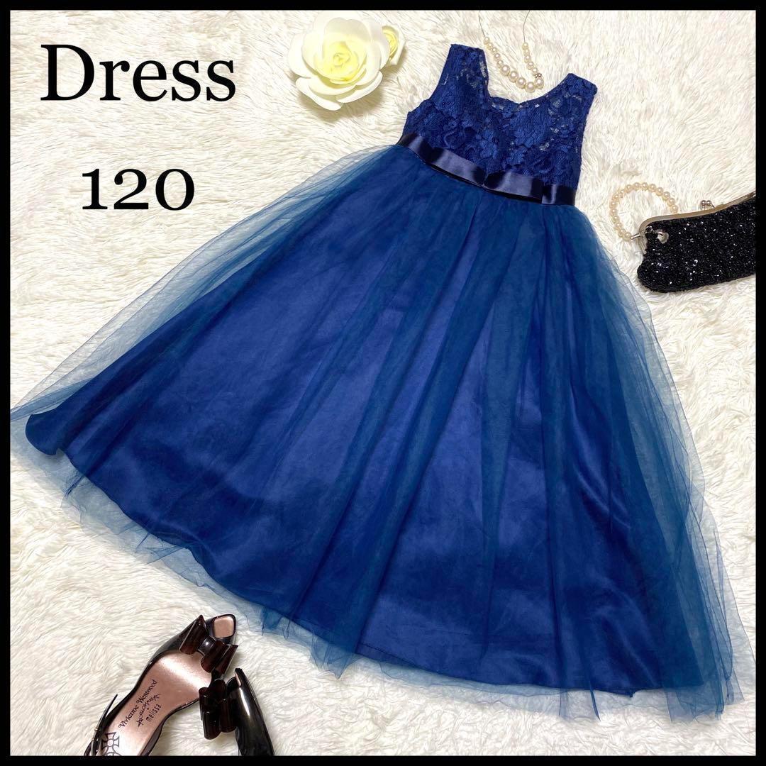 キッズパーティドレス レース チュール フレア リボン 可愛い 発表会 結婚式 ネイビー キッズ 120