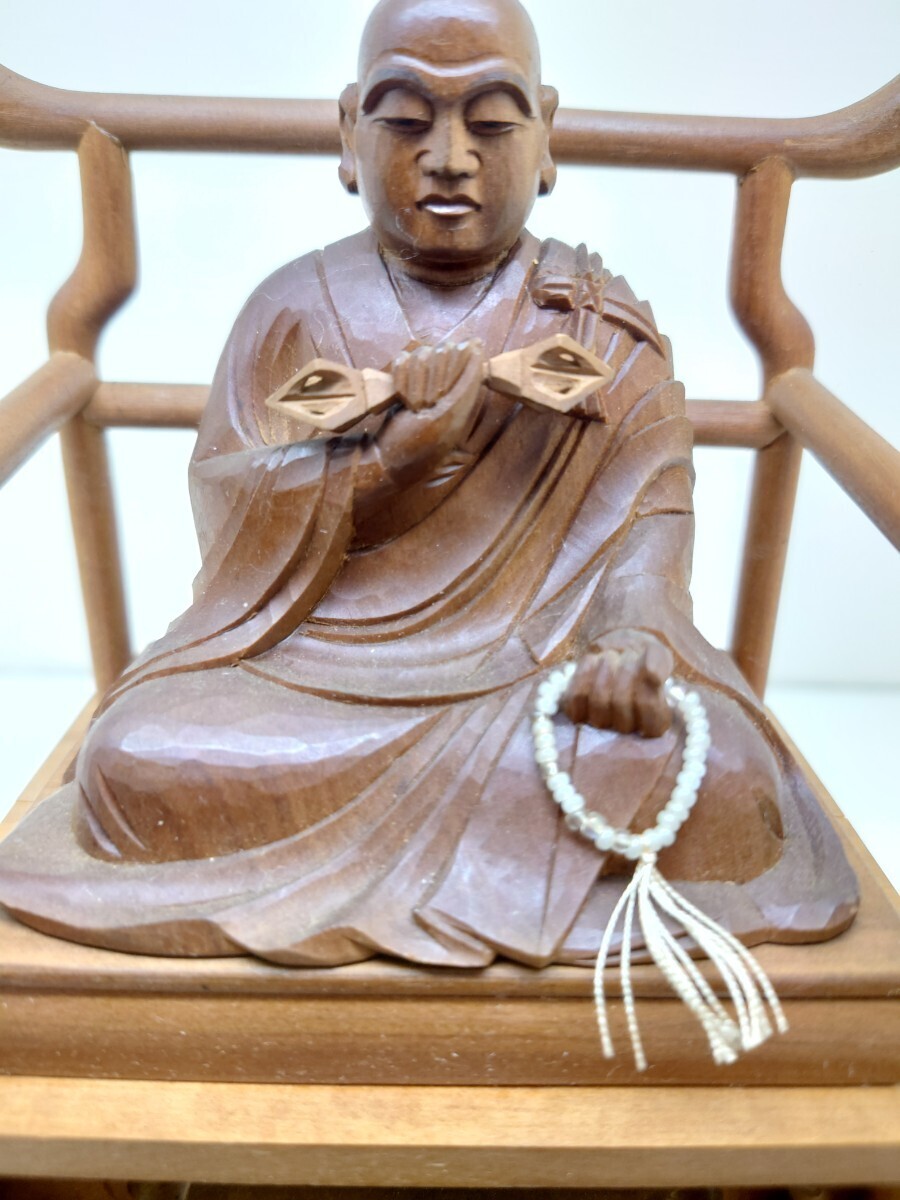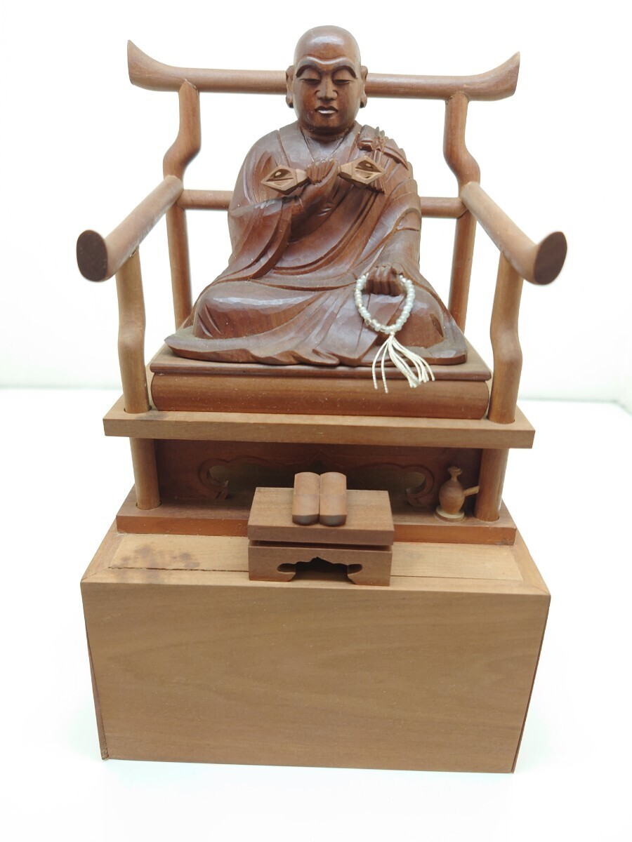 弘法大師 3寸 白檀 収集品 幅13センチ 奥行き11センチ 総高さ21センチ 仏像の匂いを嗅いでみると白檀の香りがかすかにします。台座にヒビが入ってたり(写真5枚目など)汚れのようなところ(写真一枚目靴の左のあたり)もあります。