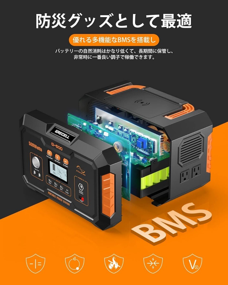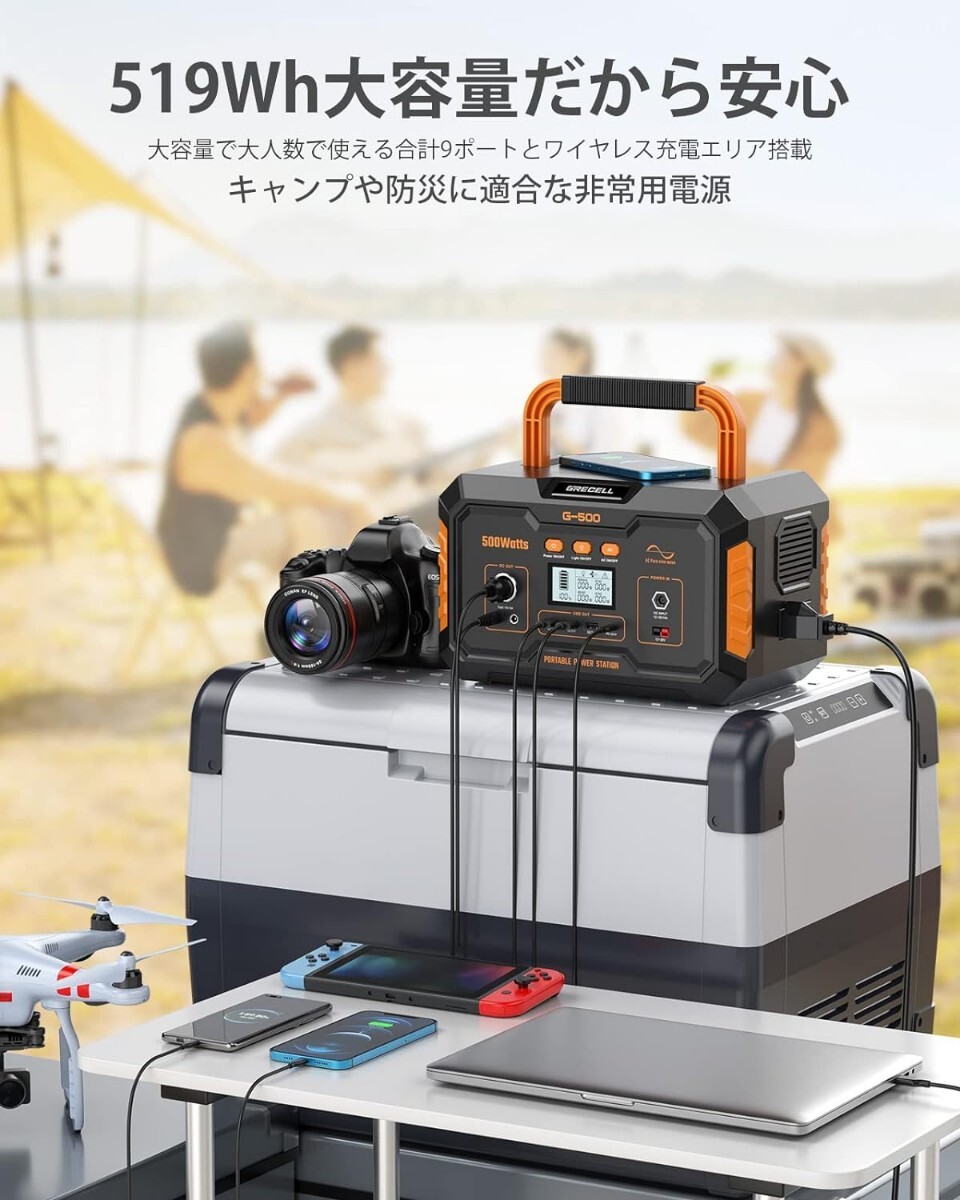 ポータブル電源 大容量 500W GRECELL 140400mAh/519wh ポータブルバッテリー 純正弦波 MPPT制御方式採用 家庭用蓄電池 PSE認証済 ワイヤレス充電搭載 10台デバイス同時充電 PD60W急速充電USB-C/USB-A 合計四ポート出力 AC(瞬間最大1000W)/DC出力 車中泊 キャンプ アウトドア 地震停電対策 防災グッズ LED/SOSライト付き 非常用電源