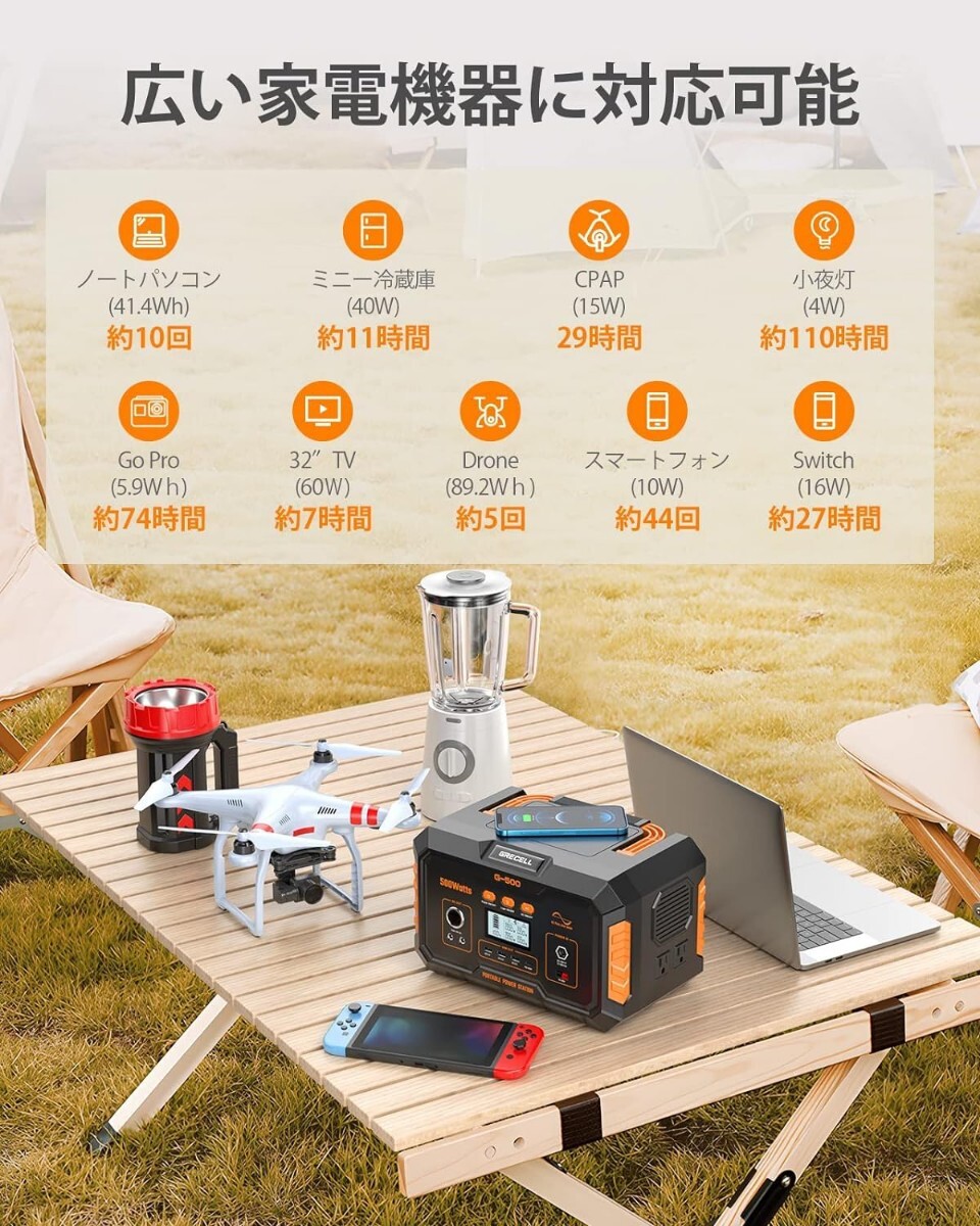 【最大10台デバイスに同時充電】AC(500W 純正弦波)*2、USB-A*3、PD60W*1、DC55*25mm出力*2、ワイヤレス充電10W*1、シガーソケット出力*1を含む10出力ポートから同時充電を行えます。ワイヤレス充電を搭載しているので、充電ケーブルがなくてもスマホを充電することができます、とても便利です。PD60W急速充電でiPhone 13などスマホの充電はもちろん、最新型のMacbookやiPad Proにも急速充電ができます。また、小型ドローン、液晶テレビ、小型扇風機、ミニ冷蔵庫、電気毛布、プロジェクター、LED電球などへの給電も可能です。※消費電力500W以下の家電製品は本製品で使用可能です。