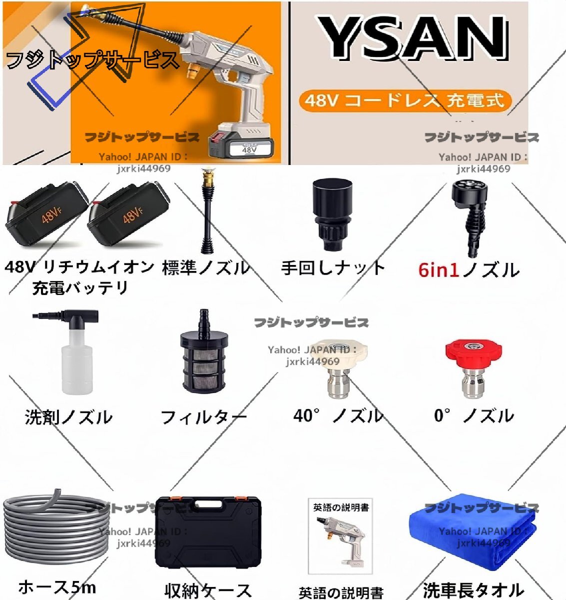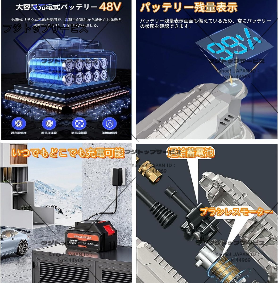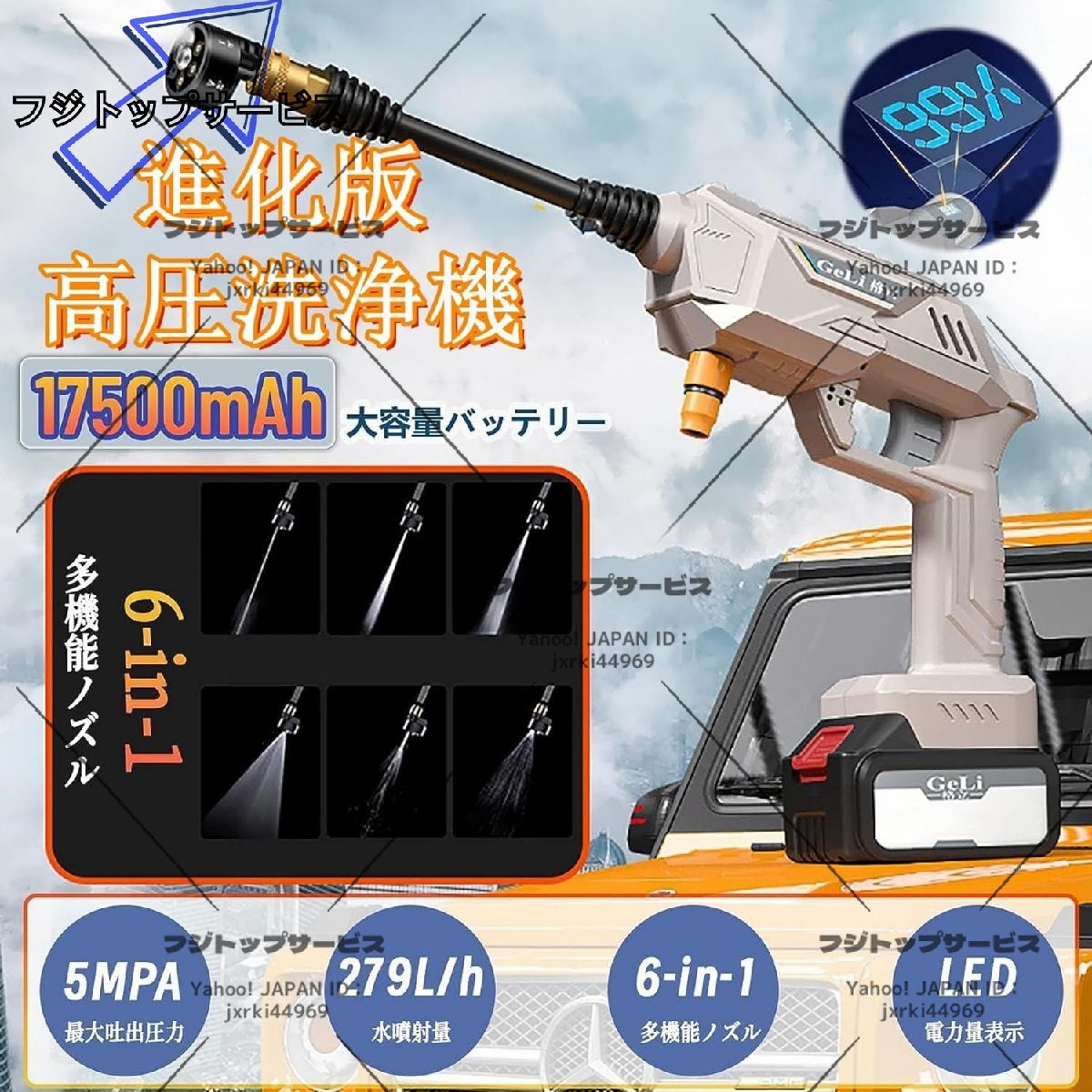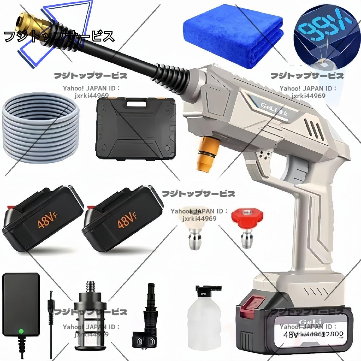 品質保証 充電式 高圧洗浄機 48V コードレス 5MPa最大吐出圧力 水噴射量5.2L/min 6種類噴射モード 6-in-1ノズル洗車 バッテリー付き F501