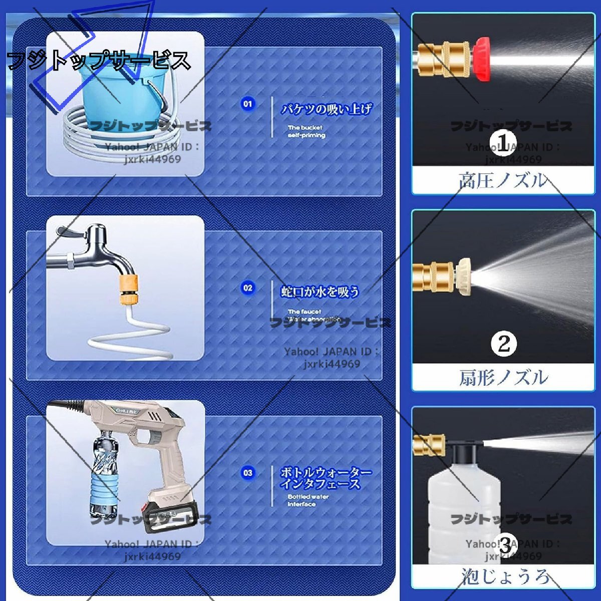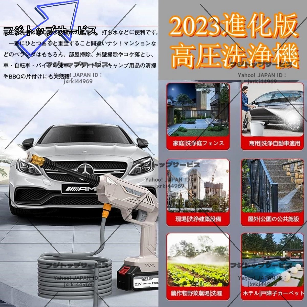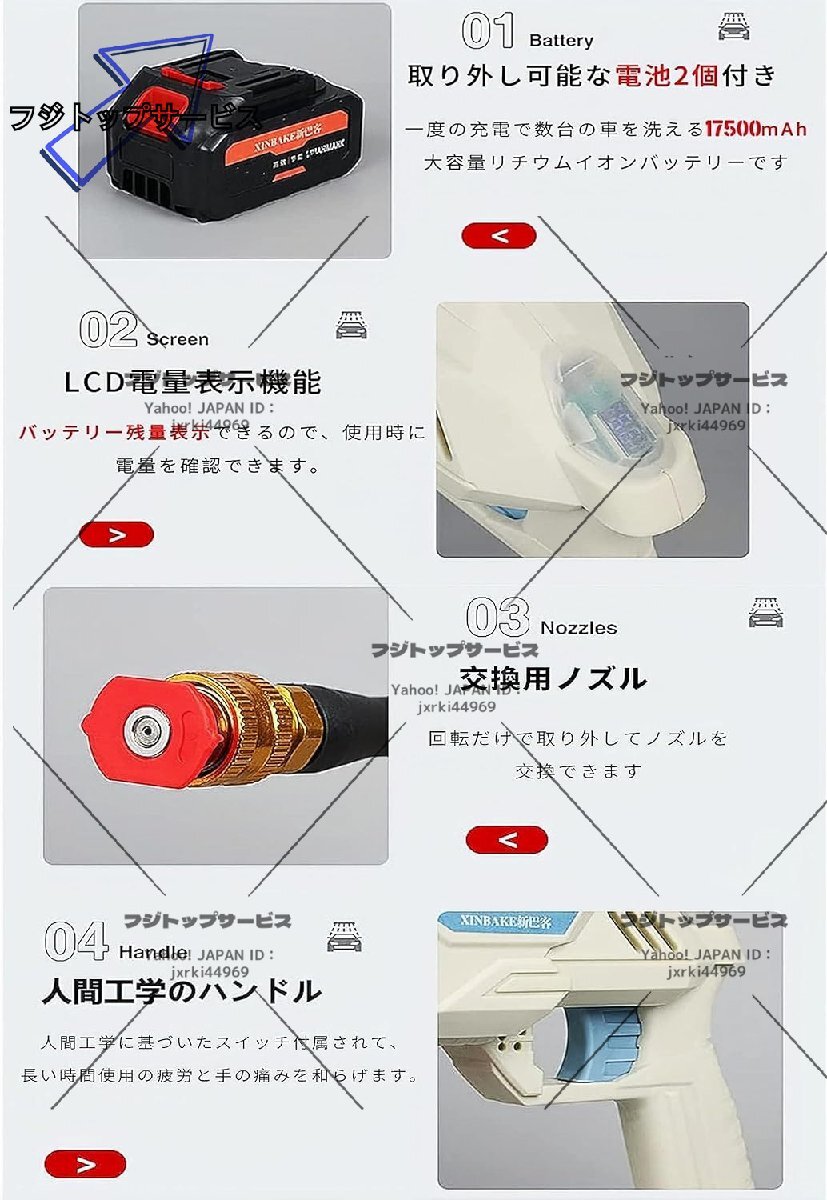【高性能ハイパワー】高圧洗浄機のガンと本体が一体化した使い勝手の良いハンディウォッシャー。吐出圧力5Mpaのパワフルな高圧噴射で、ガンコな汚れを洗い流す高圧洗浄機です。家庭用洗浄機は高性能なパワーモーターを搭載して、水を素早く吸入・加圧して噴射します。多機能洗車ガンセット内容:本体、充電器、リチウムイオン充電バッテリー*2、回転ノズル、方向調整ノズル、フォームポット、フィルター付き専用給水管(5m)、ペットボトル用給水コネクター、収納箱.(ご注意:この商品はマキタブランドの製品ではありませんが、マキタバッテリーを使用することができます。)