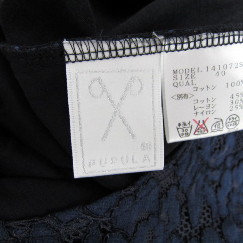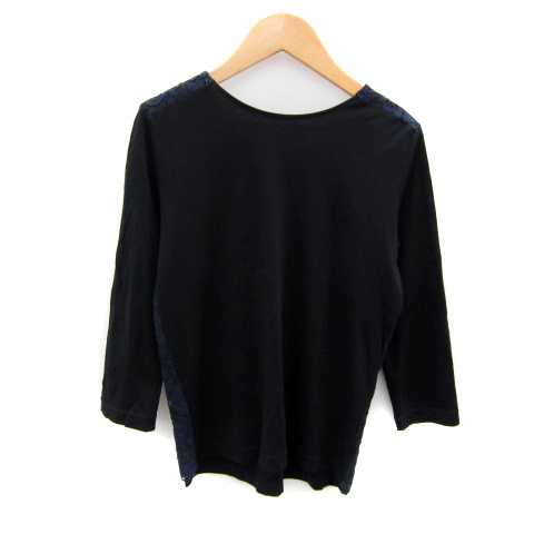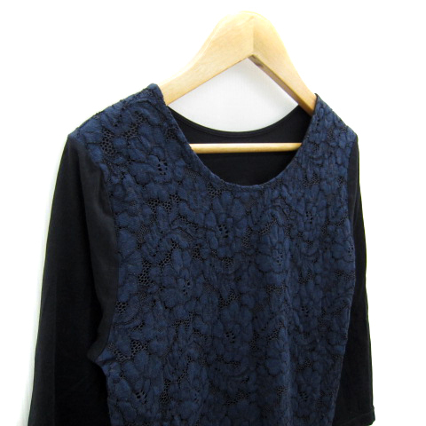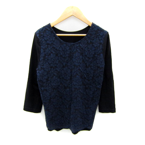 ププラ PUPULA カットソー 七分袖 ラウンドネック レース 花柄 切替 無地 40 L 紺 ネイビー 黒 ブラック /SY44 レディース