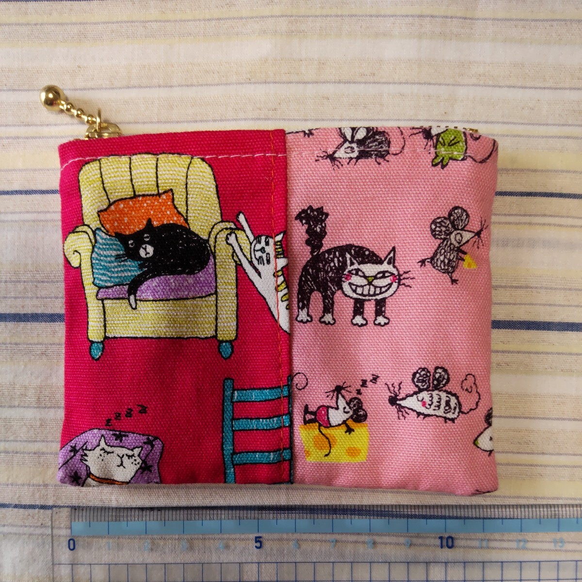 ネコとネズミ柄生地で作ったファスナーポーチです。サイズタテ9cm、ヨコ11cmくらいです。10cmのファスナー使用。