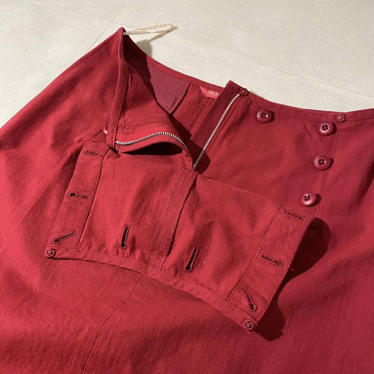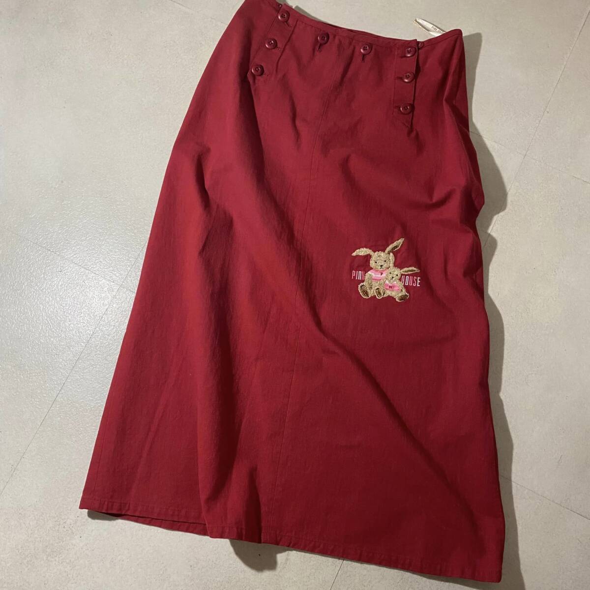 赤にフロントうさぎの刺繍、セーラーパンツスタイルのボタンフロントのロングスカートです。