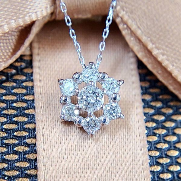 清楚なK18ホワイトゴールドの枠に、美しい輝きを放つ天然ダイヤモンドを使用した、可憐なペンダントです。