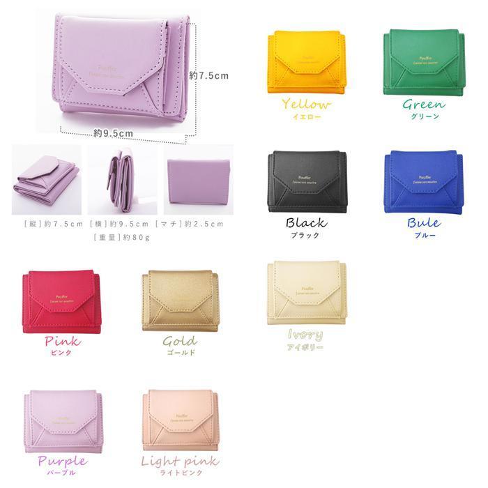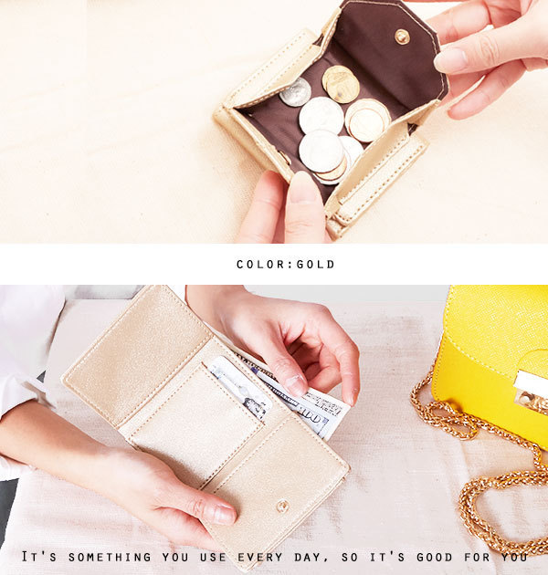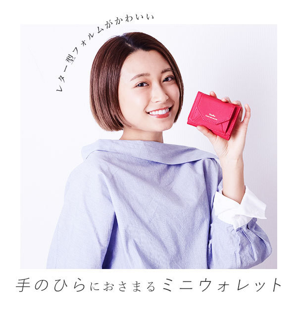 商品説明 | 手のひらにすっぽり収まる、レター型フォルムがかわいいミニウォレットです。正面のコイン収納は、大きく開いて小銭の出し入れがしやすい☆スナップボタンで開く折り畳み式のメイン部分にはお札もしっかりと収納でき、カード用スリットも3か所用意されているのも嬉しいポイント!さらに、サコッシュや小さめのママバッグにも入るコンパクトさ。キレイ目のカラーバリエーションで、お出かけの時のファッションにもさりげなく合わせられます。 |