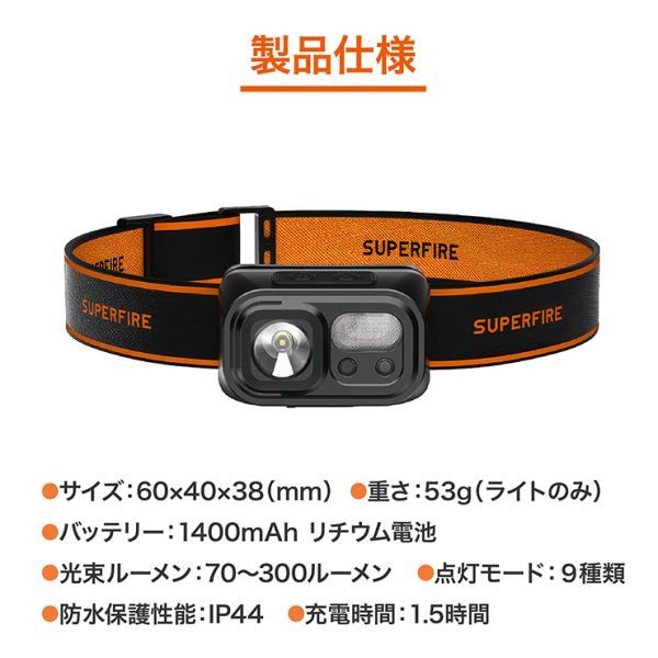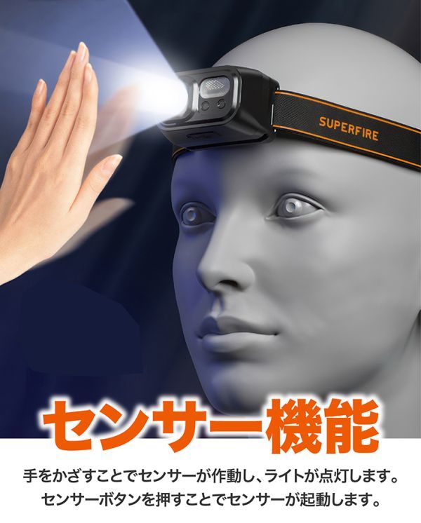 充電式 メットライト ヘッドライト センサー機能 角度調整可 9種類モード 遠光 散光 SOS点滅 軽量 高輝度 登山 夜釣り キャンピング ハイキング ランニング 防災 作業用 ベルト調整可 IP44防水