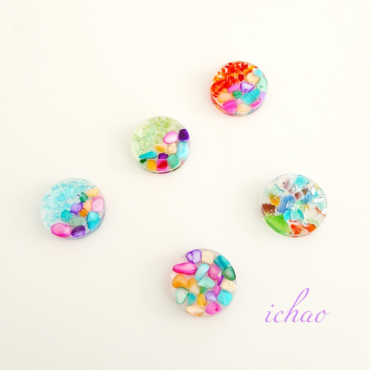 ひとつひとつ手作りかつ自然のものなので、シェルやガラスの大きさ、発色、配置、色合い等異なります。写真のものは一例です。また、気泡が入ってしまうこともあります。予め、ご了承ください。