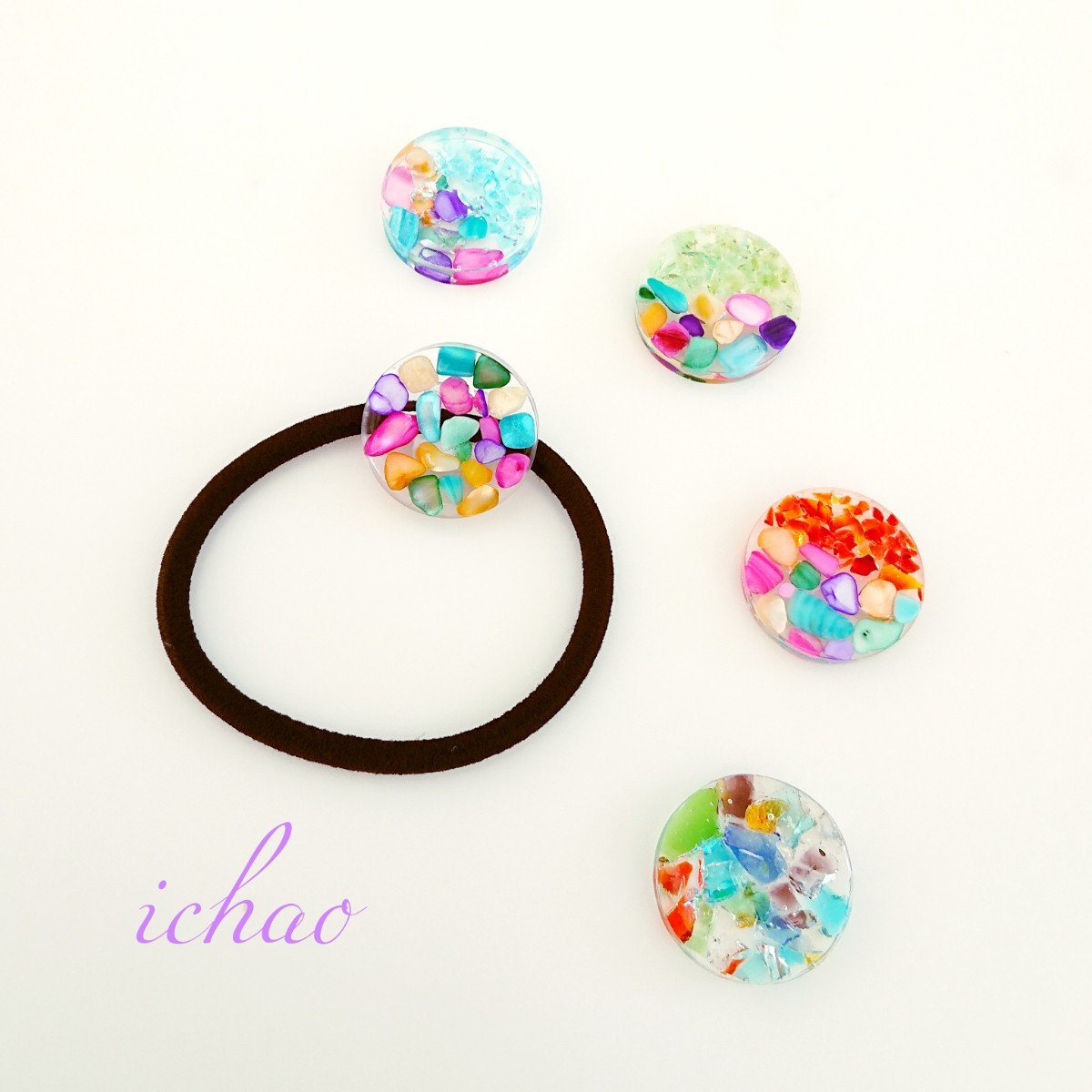カラフルシェルと琉球ガラスを一緒にレジンで閉じ込めたとっても可愛いヘアゴムです(^^)