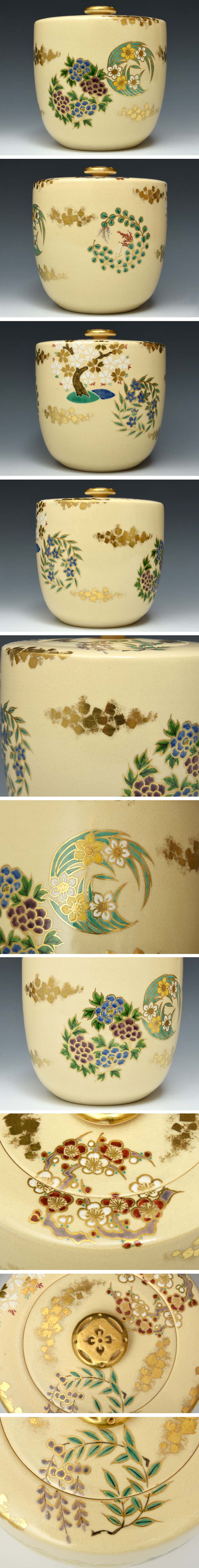 | 仁清の意図をしっかりと再現、絵付けされ金彩、色絵で草花文が生き生きと施されております。 共蓋の摘みは七宝文様です。 雲金の技法も為され、気品が感じられます。 高台内に銘あり。 キズ等なく良い状態です。 ※撮影の際に生じた写り込みなどがございます。 ご理解の程よろしくお願い致します。 |