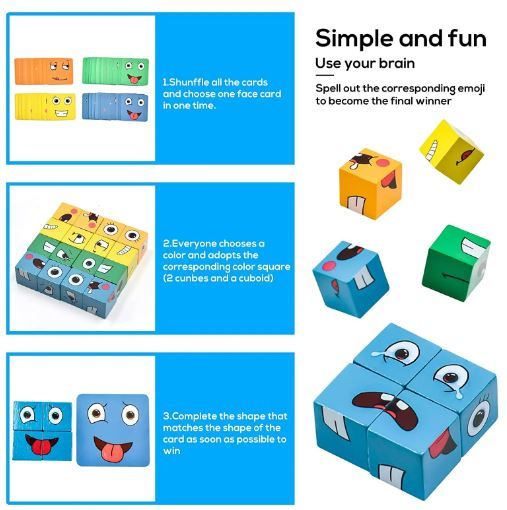 スキルの向上: 表現ブロックのおもちゃはキュートで楽しい外観なので、子供はこのおもちゃにすぐに集中して楽しむことができます。 それは子供の注意を刺激し、手と目の協調、論理的思考、実践的な能力、細かい運動技能を高めます。 また、楽しいゲームは子供を電子スクリーンから遠ざけるため、視力を保護するのに役立ちます。