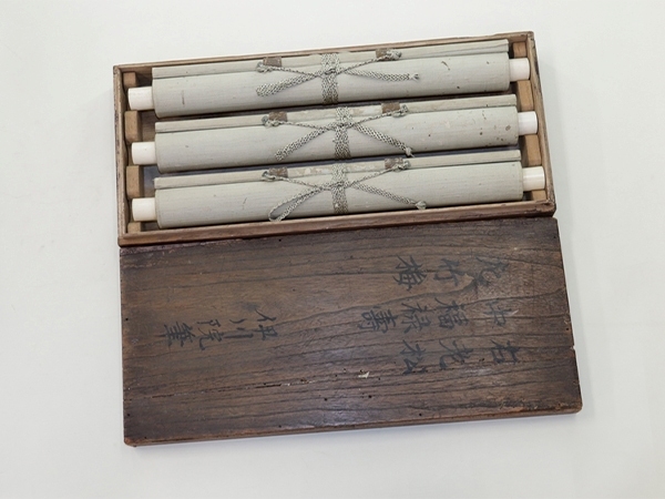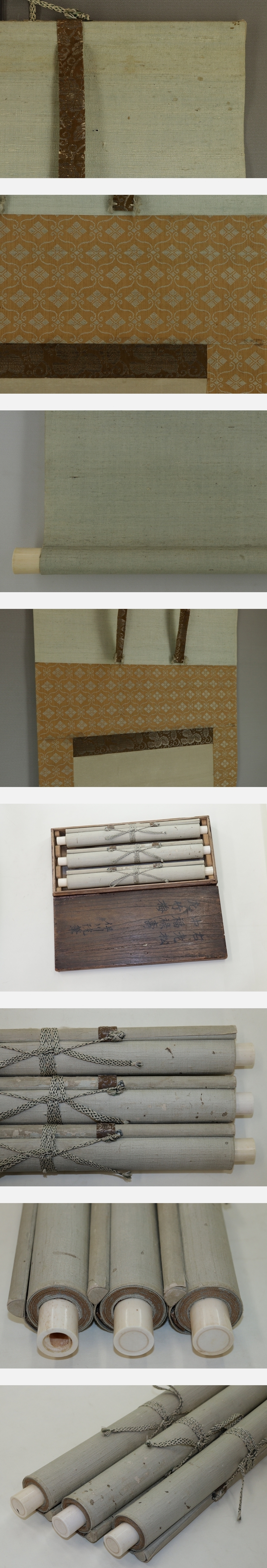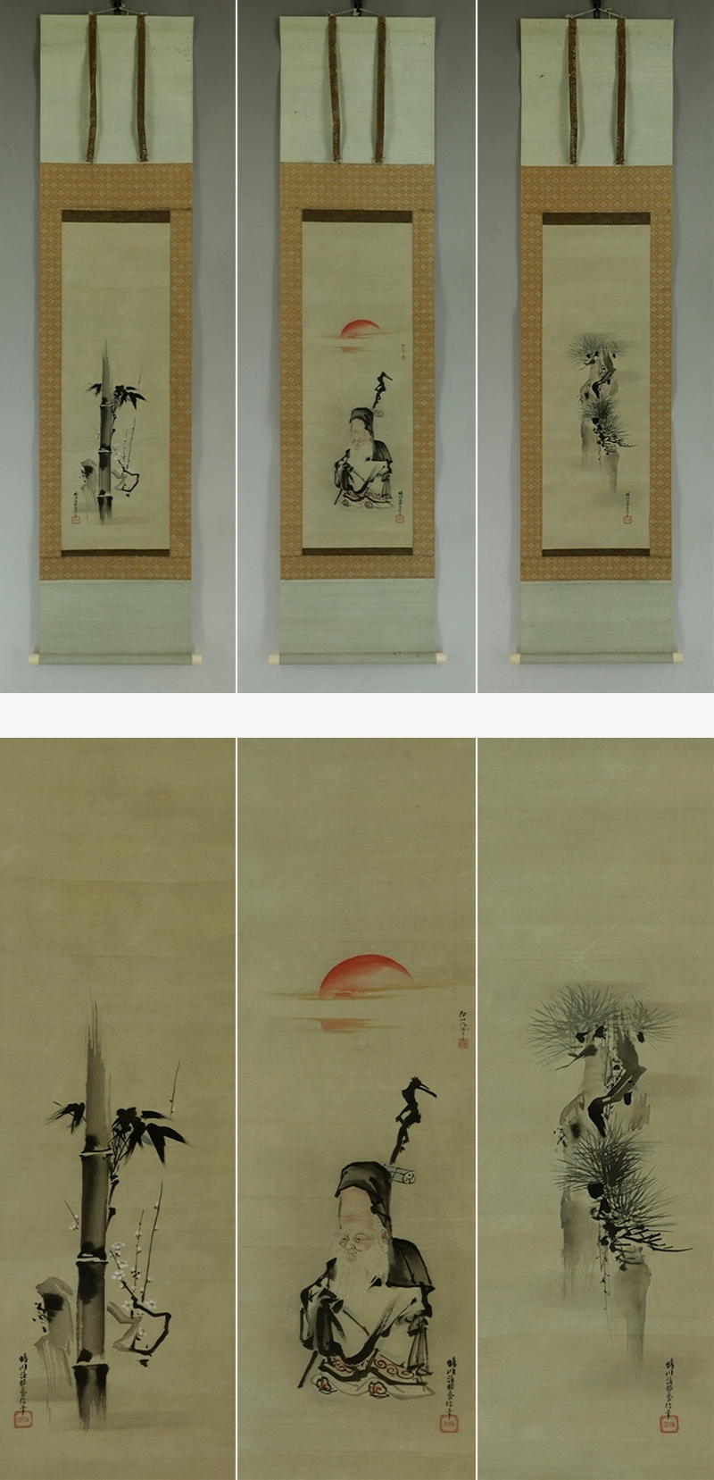 | №2301150【真作】狩野伊川院【三対幅・慶祝図】◆絹本◆合箱◆掛軸 | |