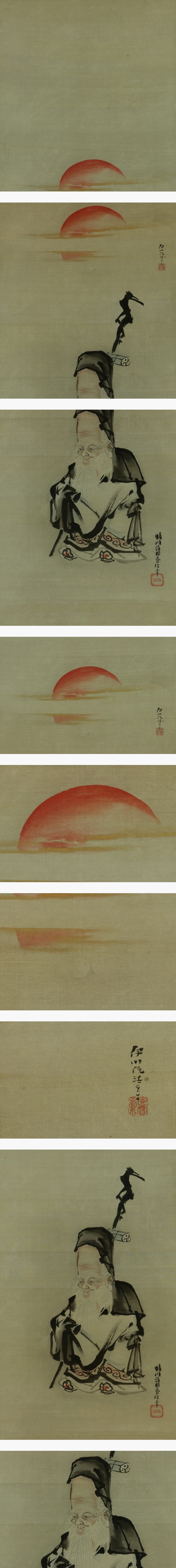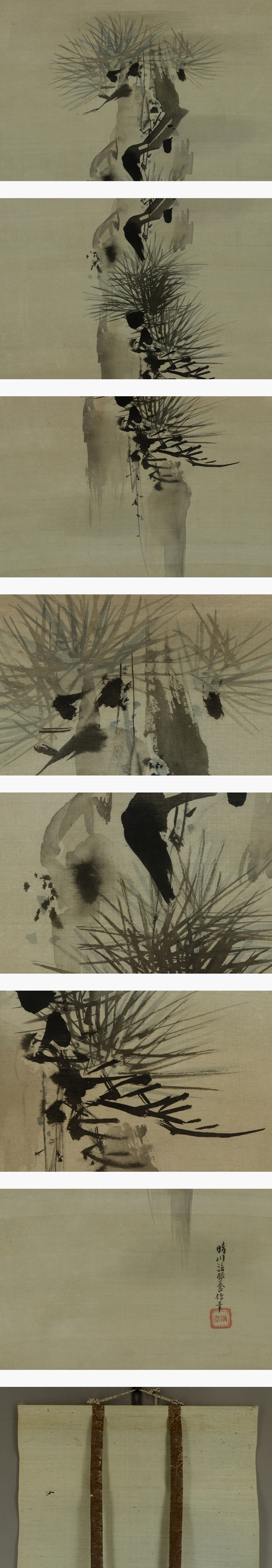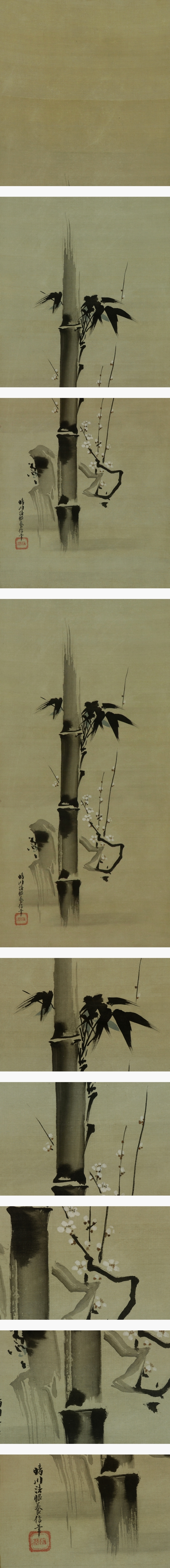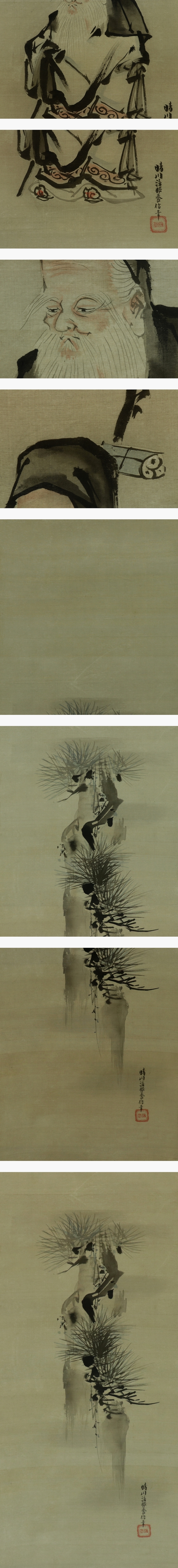 狩野伊川院 かのう-いせんいん(1775-1828) 江戸後期の画家。 養川院惟信の子。名は栄信、号は玄賞斎。 絵を父に学び、その父に「吾及ばず」と言わしめた。 近世狩野派の名手。水墨に金泥を施す技法に特色を発揮する。 また茶道を能くし松平不昧の恩顧を受ける。文化13年法印に叙せられ伊川院と称した。 文政11年(1828)歿、54才。 本紙は、染み、汚れ、折れ、皺、ヤケがあります。 表装は、染み、汚れ、折れ、皺、虫食い、破れ、ほつれ、軸先に欠損があります。 【サイズ】 作品 横約27cm×縦約81cm 表装 横約37.5cm×縦約159cm |