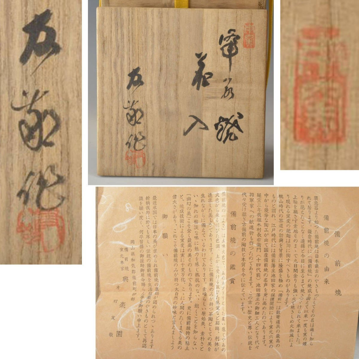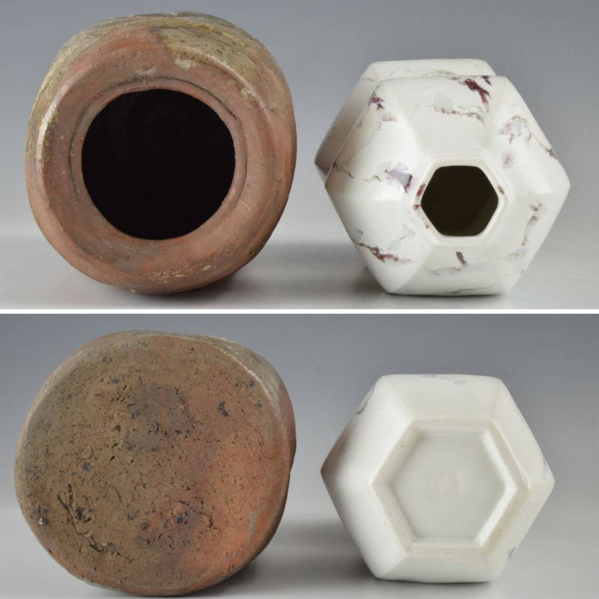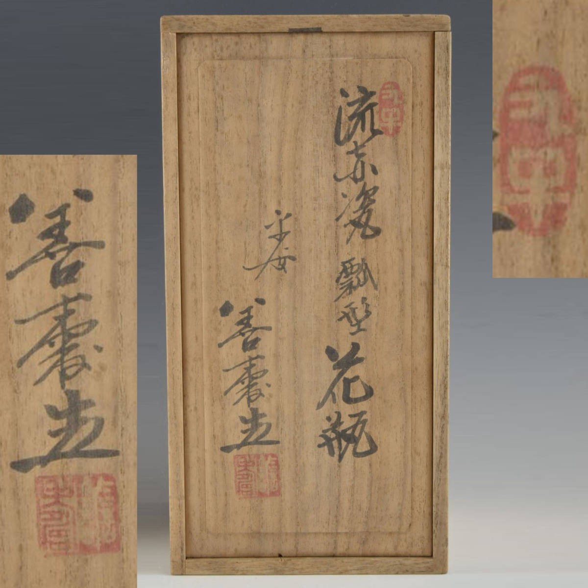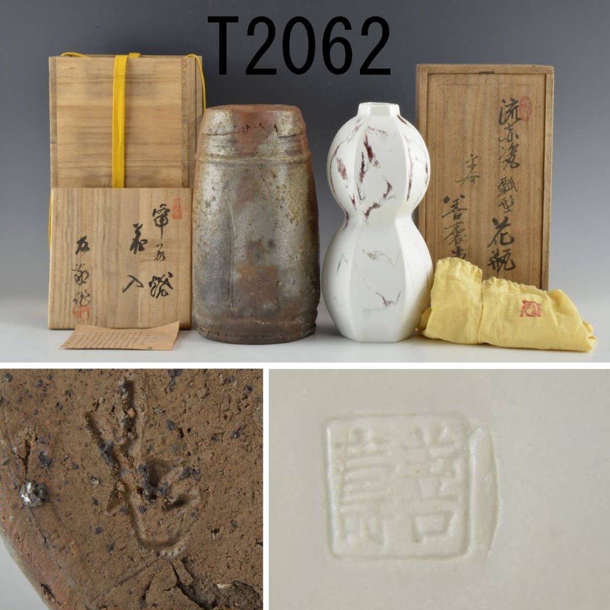 状態:木村友敬・備前焼花入は大体良好。底に掻き銘「長」あり。底に押印「善壽」銘ありの流赤瓷瓢型花瓶は良好。京焼。