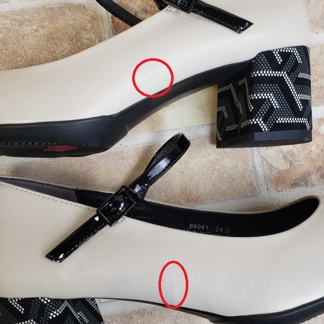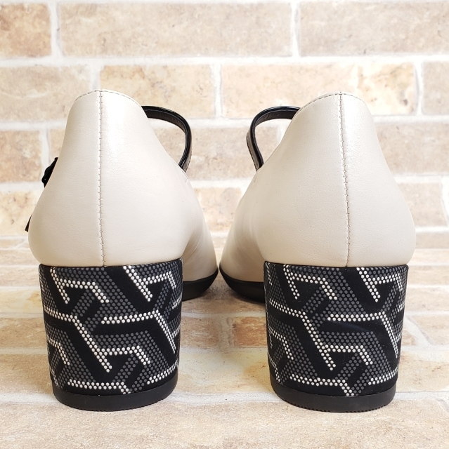商品説明 | ・幾何学柄がデザインされた チャンキーヒール が素敵な【 ポインテッドヒールニーカーストラップ 】の ポインテッドトゥ レザー パンプス です。 エナメルレザーの甲ストラップでホールド感があります。 ・素材 レザー(本革) ・カラー アイボリー ブラック(画像参照) ・付属品 無し ・サイズ 24.0cm アウトソール最大幅 約8.7cm アウトソール最長幅 約26.0cm ヒール 約5.7cm ・商品コンディション 両足外側中央あたりに薄い色移りがあります。(赤丸部分 画像参照) 右足のヒールに薄い白っぽいスレ汚れがあります。(画像参照) その他着用感の少ない良いコンディションです。(画像参照) ※個人保管商品ですので、店舗コンディションをお求めの方はご入札をお控えください。ご理解の上ご入札お願いいたします。 A1361 |