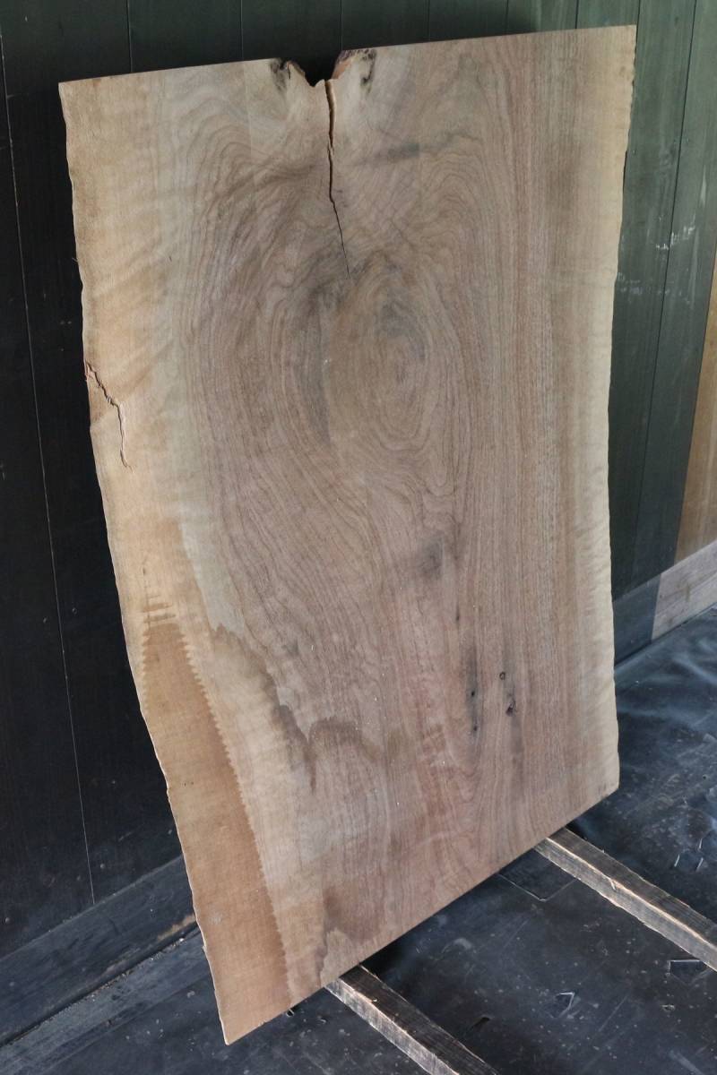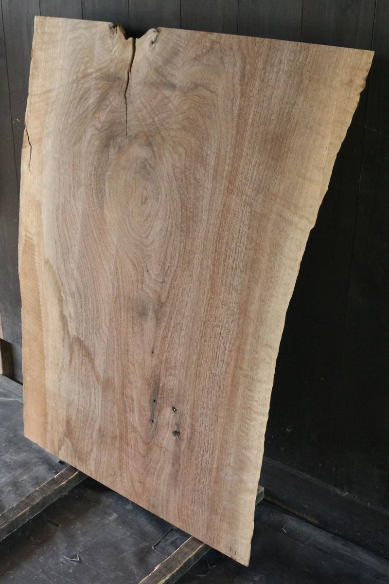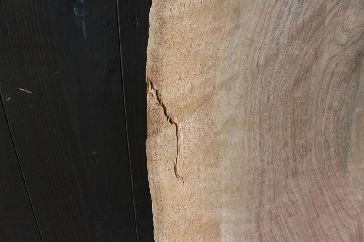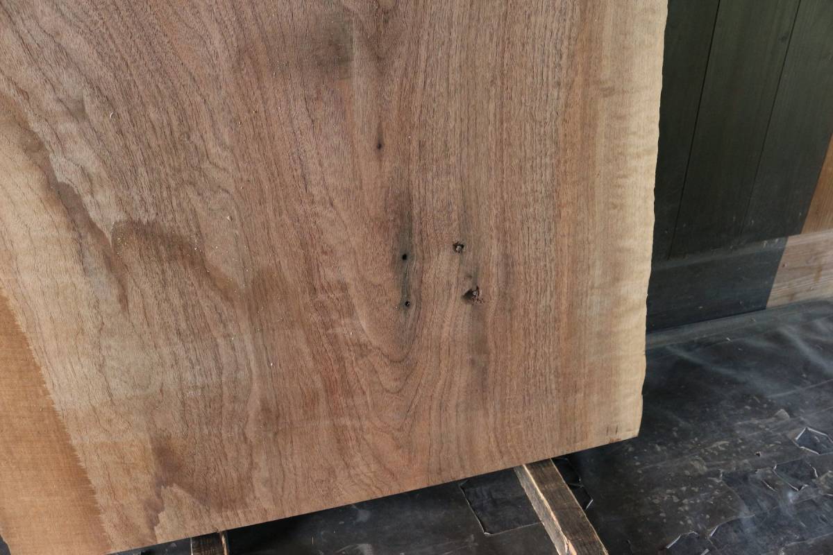 材質:ウォールナット(一枚板) 寸法:幅1080mm × 奥行830~735mm × 厚み59mm 加工:両面プレーナー加工済み、無塗装 人気のウォールナット材(人工乾燥済み)の荒板となります。 使い方は様々ですが、1m程度の幅で比較的取り扱い安いサイズ感となっています。 木目や節、自然の息吹を感じられる形状を残した状態。 裏面のほうが、ウォールナットらしい雰囲気が感じられる色合いや木目が浮き上がっています。 これからの加工が楽しみですね。 製材後も生き物のように動きを生じるものとなりますので、反り、歪み、割れなどが生じる可能性があります。 |