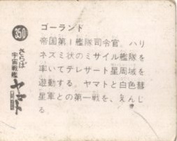 1978年公開の映画「さらば宇宙戦艦ヤマト愛の戦士たち」の、上映当時発売された(多分)アマダの10円2枚引きカード「350 ゴーランド」です。