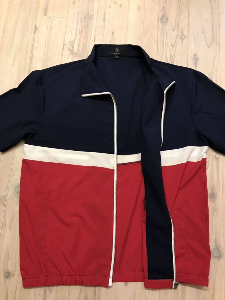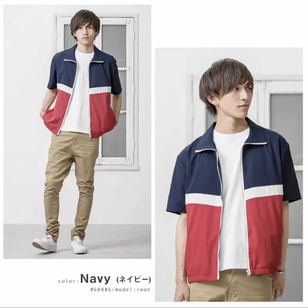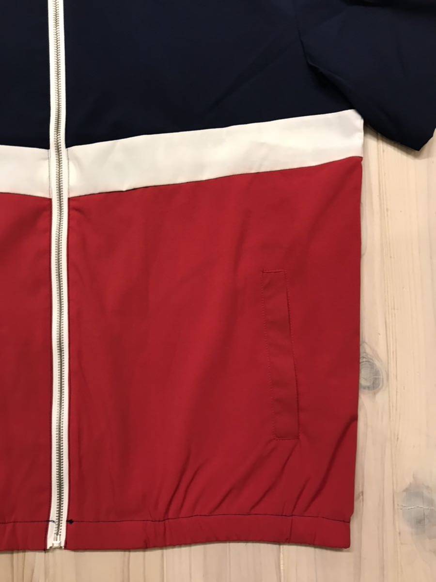 ネイビー、白、赤のトリコロールでフルジップアップ、裾はゴムリブなので襟までジップ立てて着るならストリートカジュアルっぽい感じでイケてると思います。