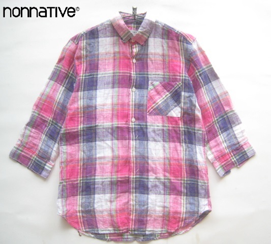 美品日本製!!ノンネイティブ NONNATIVE*麻100% 7分袖チェック柄リネンシャツ 0 実寸S ピンク×白×黄×緑×紺×橙