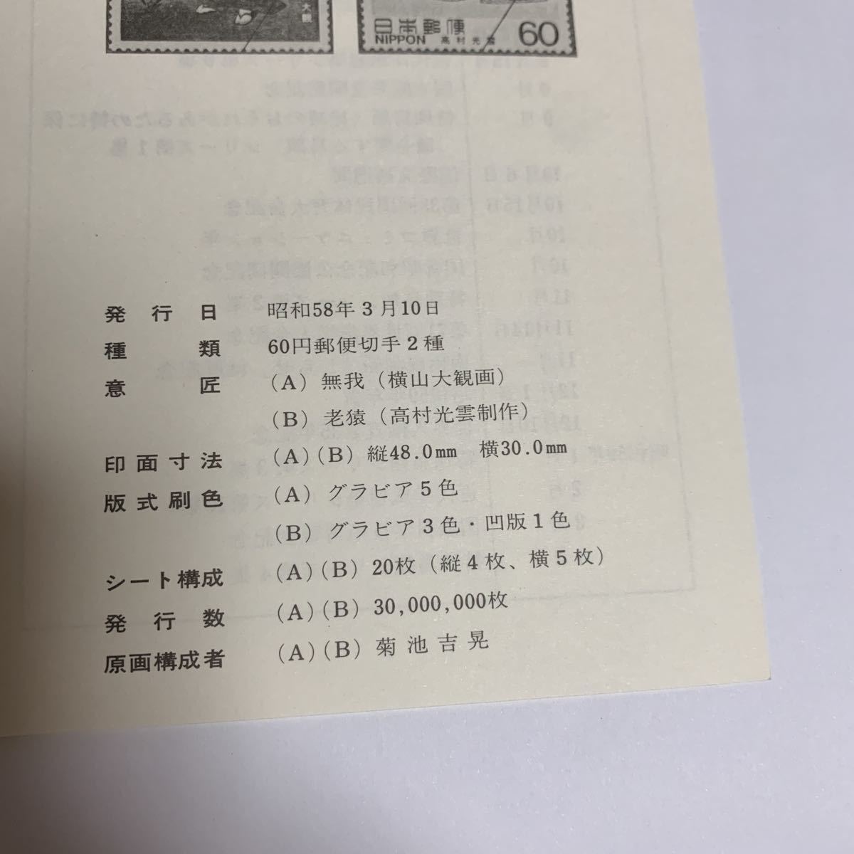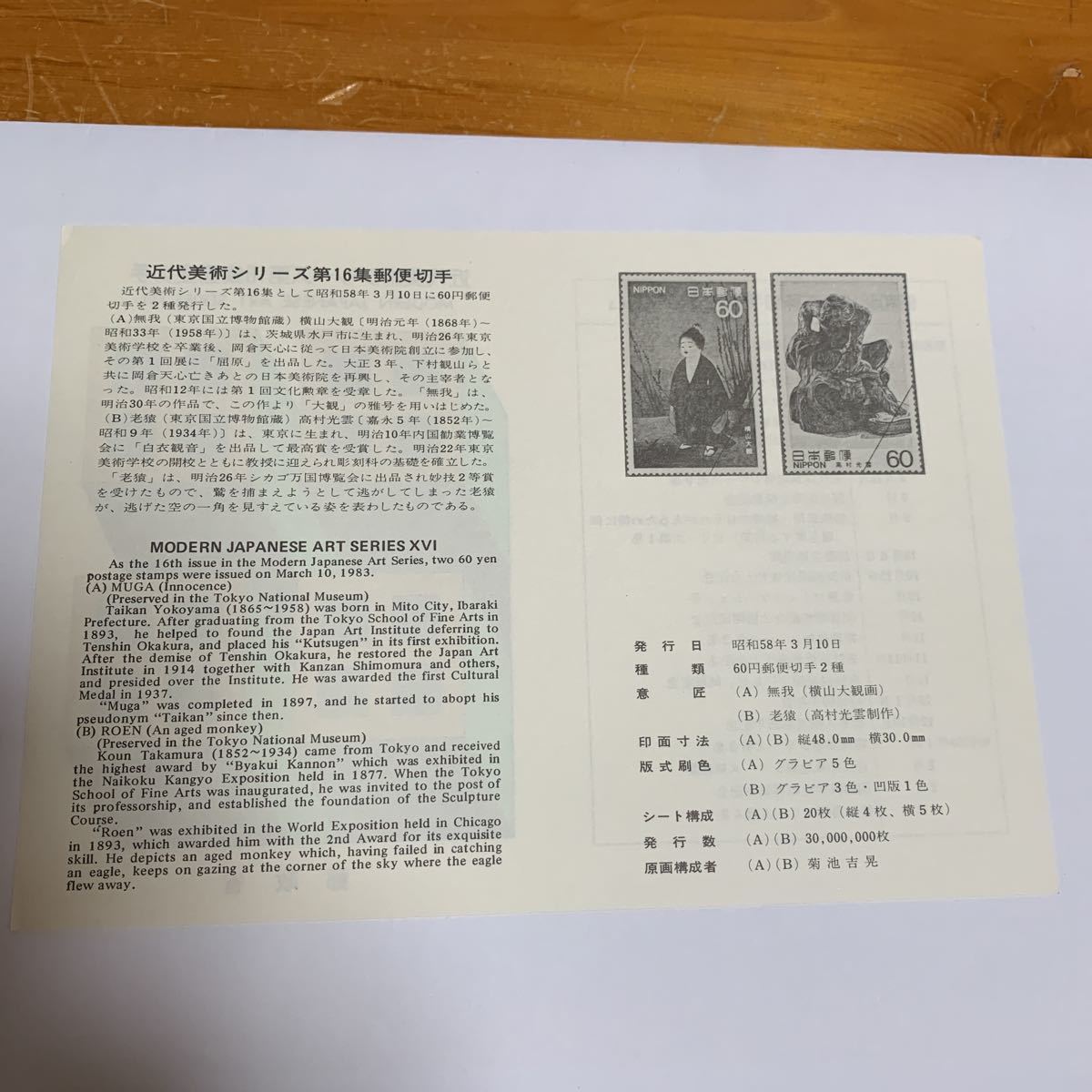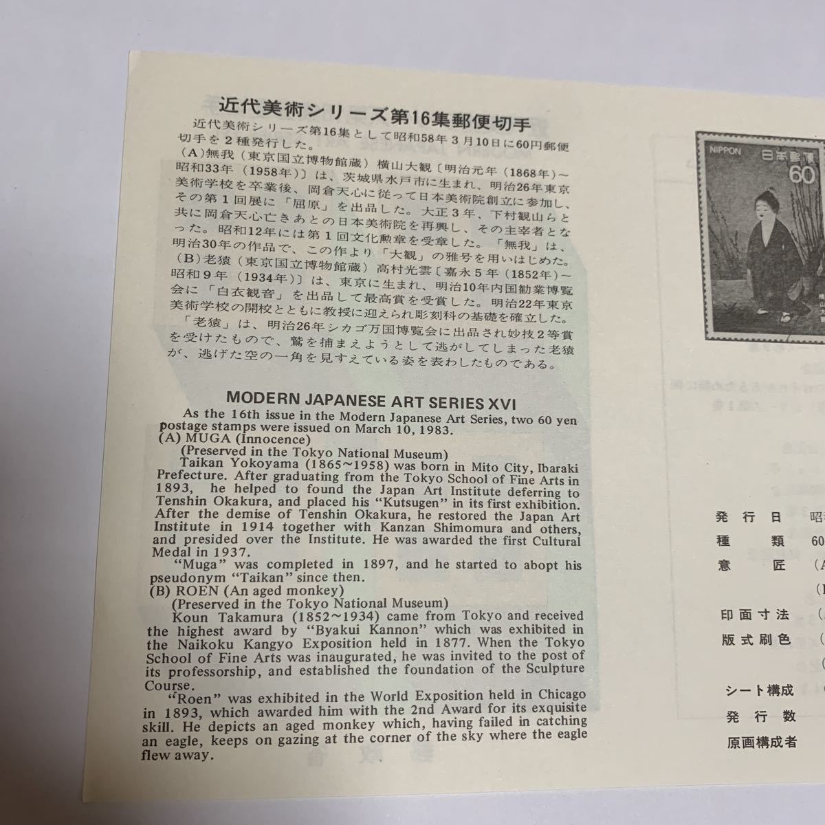 リーフレット 切手なし 1983年 郵政省 近代美術シリーズ第16集郵便切手 昭和58年3月10日 レア (A) 無我(横山大観画)(B) 老猿(高村光雲制作)希少 非売品 美品 送料無料の出品です。 サイズ横21.1センチ縦15センチ 納戸の整理(断捨離)で今後使用予定が ない為出品しました。 衣装ケースに入れて保管してました。