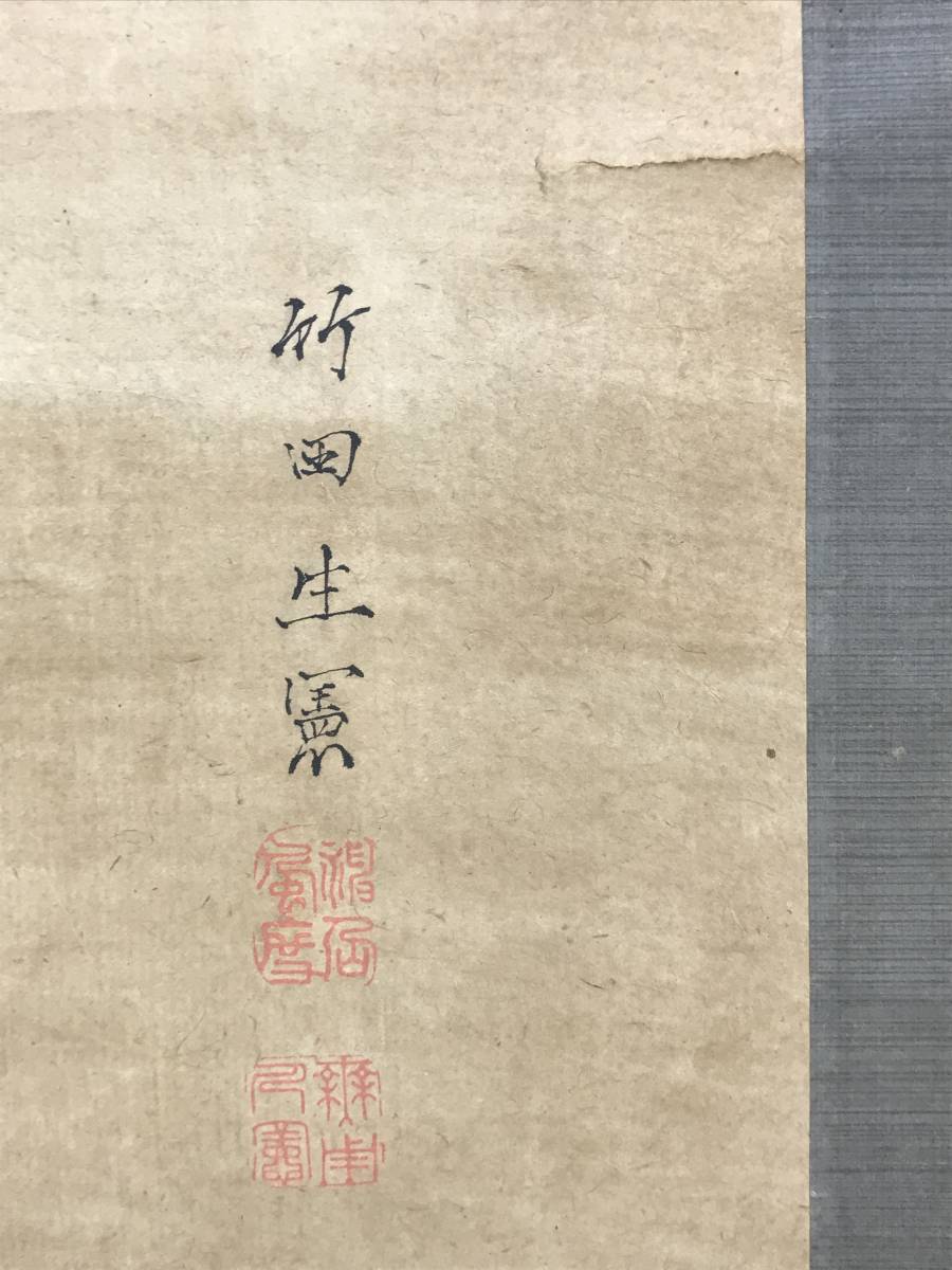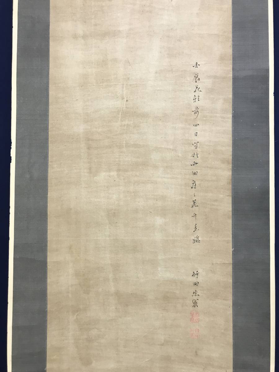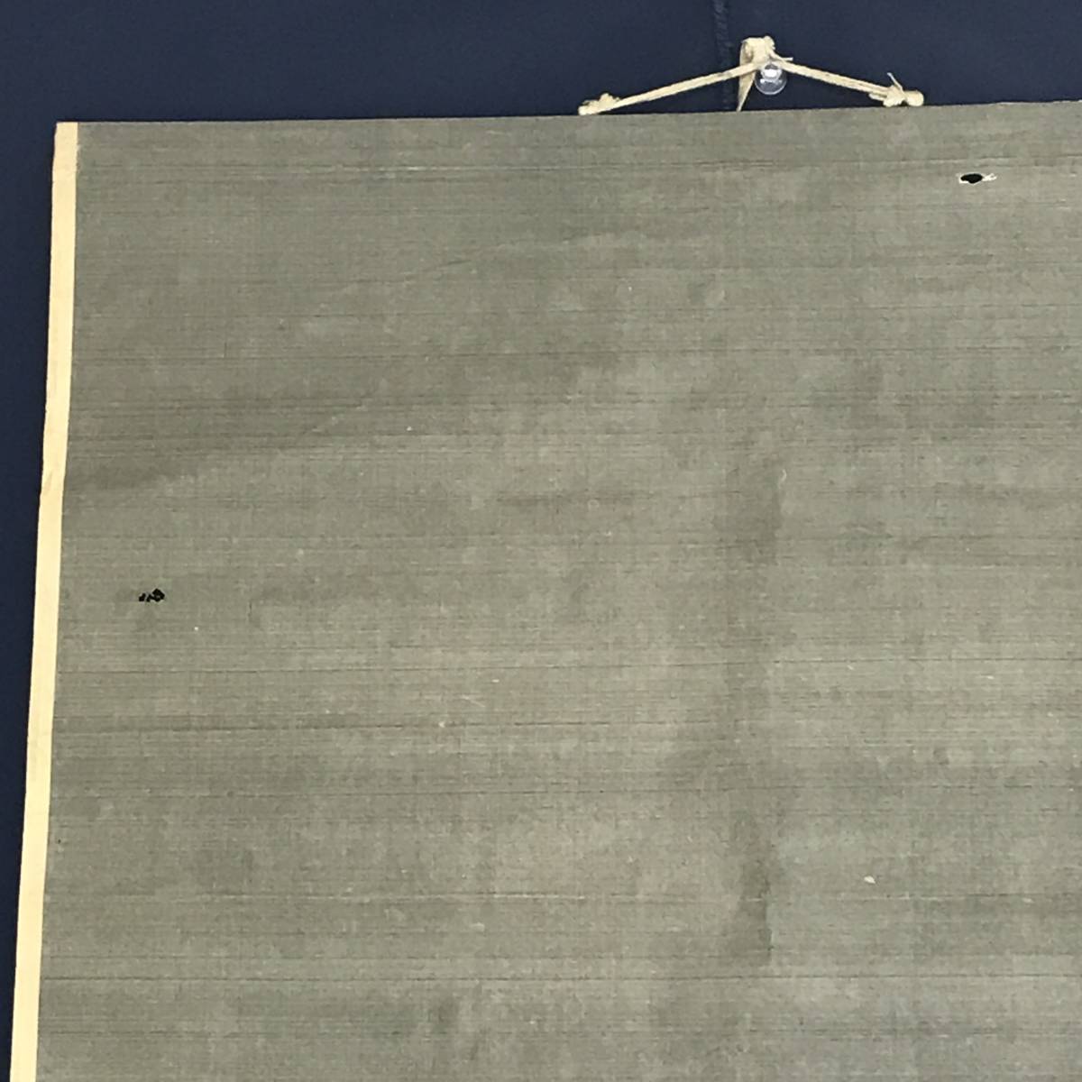 【作品状態】 本紙は紙本です。 本紙は時代感あり、全体に多数の汚れシミあります。表装は紙表装で時代感あり、数ヶ所の欠損、虫穴あります。