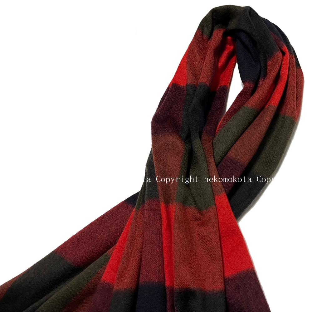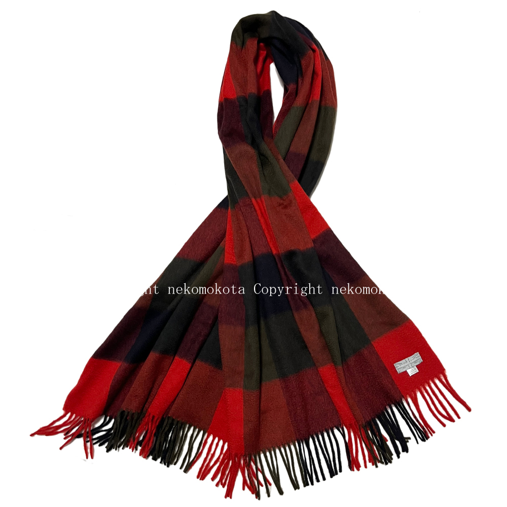 ジョシュアエリス Block Check カシミヤ ストール 税込み定価:62,700円 アメリカのアウトドアブランドでも多く使われるブロックチェック柄。 2色使いのチェックとして馴染みの深いこの柄を、3色使いでオリジナルに配色。 色鮮やかな赤にカーキを組み合わせスタイリッシュニュアンスが漂うこちらの配色は、普段のカジュアルスタイルにもマッチし易く、安心感の感じられるコーディネートに仕上がります。 素材はカシミヤ100%。 オーナーであるアンドリュー・シールが手掛けた原毛を使用。 生地織から仕上げまでの工程に約50名の経験ある技術者が携わっています。 獣毛生地の起毛技術に関しては英国のみならず、ヨーロッパ、欧米の大手メゾン、ブランドから高い評価を受けており、美しい光沢と滑らかな手触りが魅力です。 ぜひいかがでしょうか。 ■色:レッド×カーキ×ブラックなど ■サイズ:フリンジ含め72cm×204cm(フリンジ8cm) ※素人寸法ですので多少の誤差はご了承ください。 ■状態:S(1度短時間使用のみの超美品。使用感、汚れ・傷等なく良好です) ※状態は上からS/A/B/C/D の評価となります ■素材:カシミア |