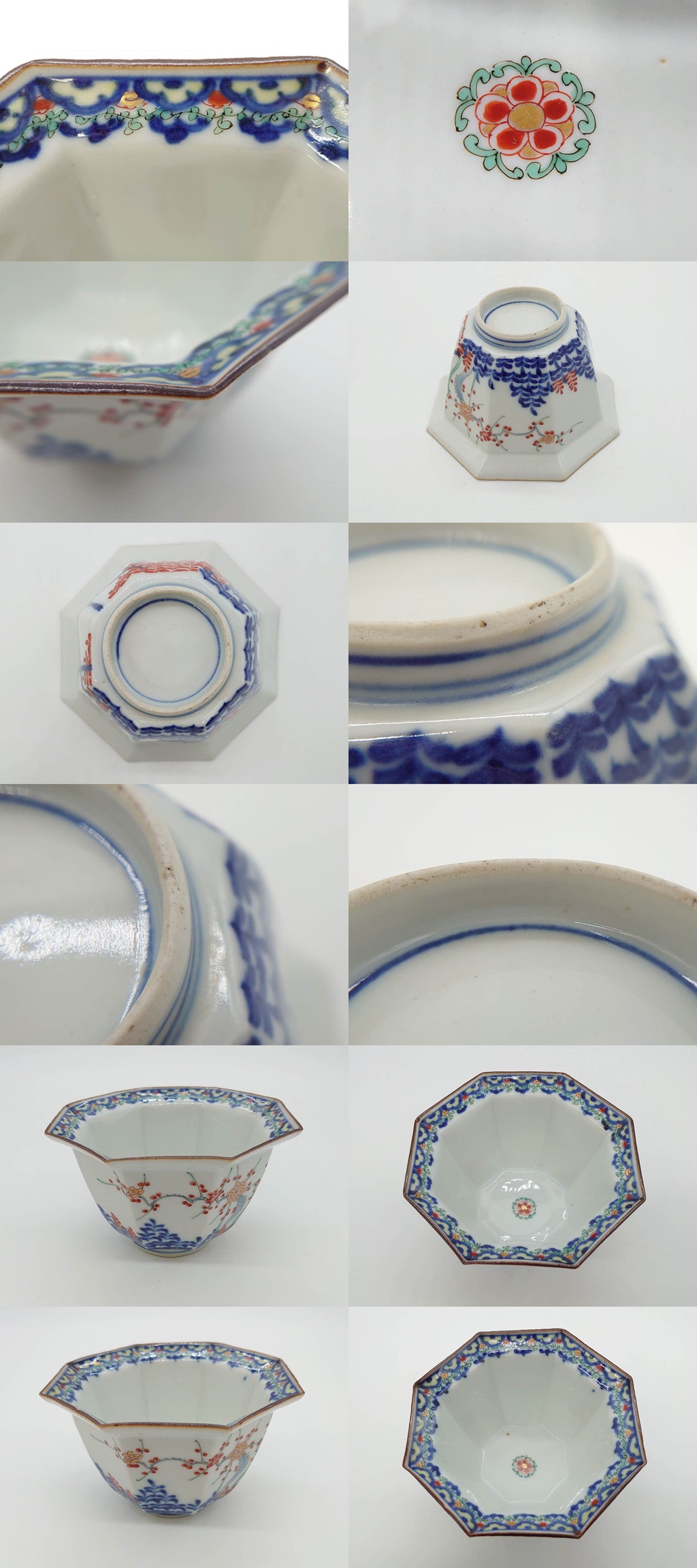 R-073018 江戸期 古伊万里 柿右衛門手 竹梅図の色絵が可愛らしい向付3客セット(小鉢、八角、和食器)(R-073018)
