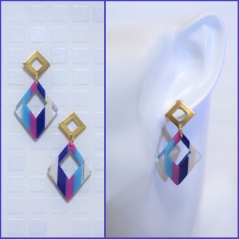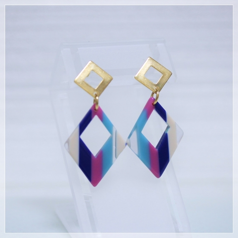 EP7488/ストライプ ひし形ピアス ステンレス製 18金加工 ダイヤ型 スクエア型 四角形 カラフル 水色ピンク青白透明 シンプルスタイリッシュ