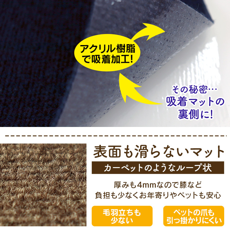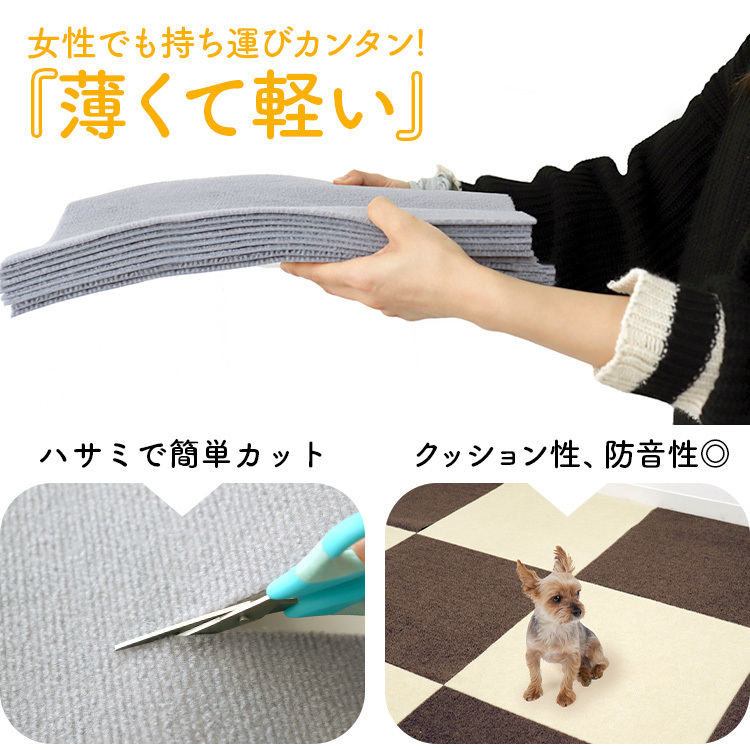 パパもママもペットも安心! 50cm 大判 パネルタイプのカーペットです。 大判サイズだから、敷く枚数も少なく、設置もラクラク! 吸着タイルなので置くだけ簡単設置! はさみで簡単にカットも出来るので、お部屋の形に合わせてレイアウト可能です! 裏面は滑り止め加工!はがしてピタッ!と吸着。 足音をやわらげてくれるので、子供部屋やフローリングのお部屋に最適です! 適度なクッション性が転倒時に衝撃を和らげてくれます! 冬は床下からの冷気をカット! 夏は冷房による温度を効率よく保ちます。 はがれにくいので掃除もラクラク!! 【商品詳細】 商品内容:吸着タイルマット ×20枚(1セット) カラー:カーキベージュ サイズ(約):幅50cm×奥行50cm×厚み4mm ※1枚 【注意事項】 ・商品はモニターによって色合いが異なって見える場合があります ・仕様/デザインは改良のため予告なく変更することがあります |