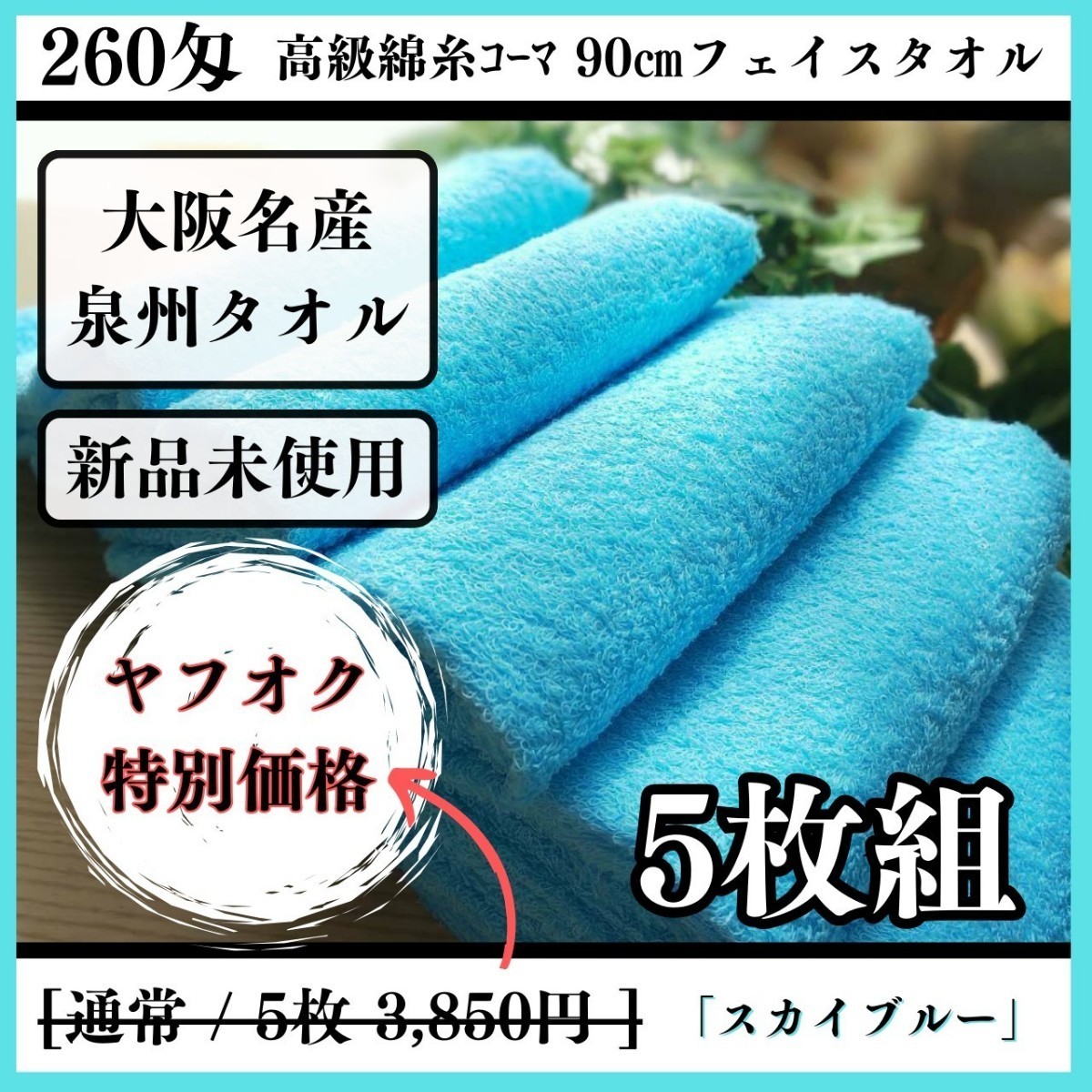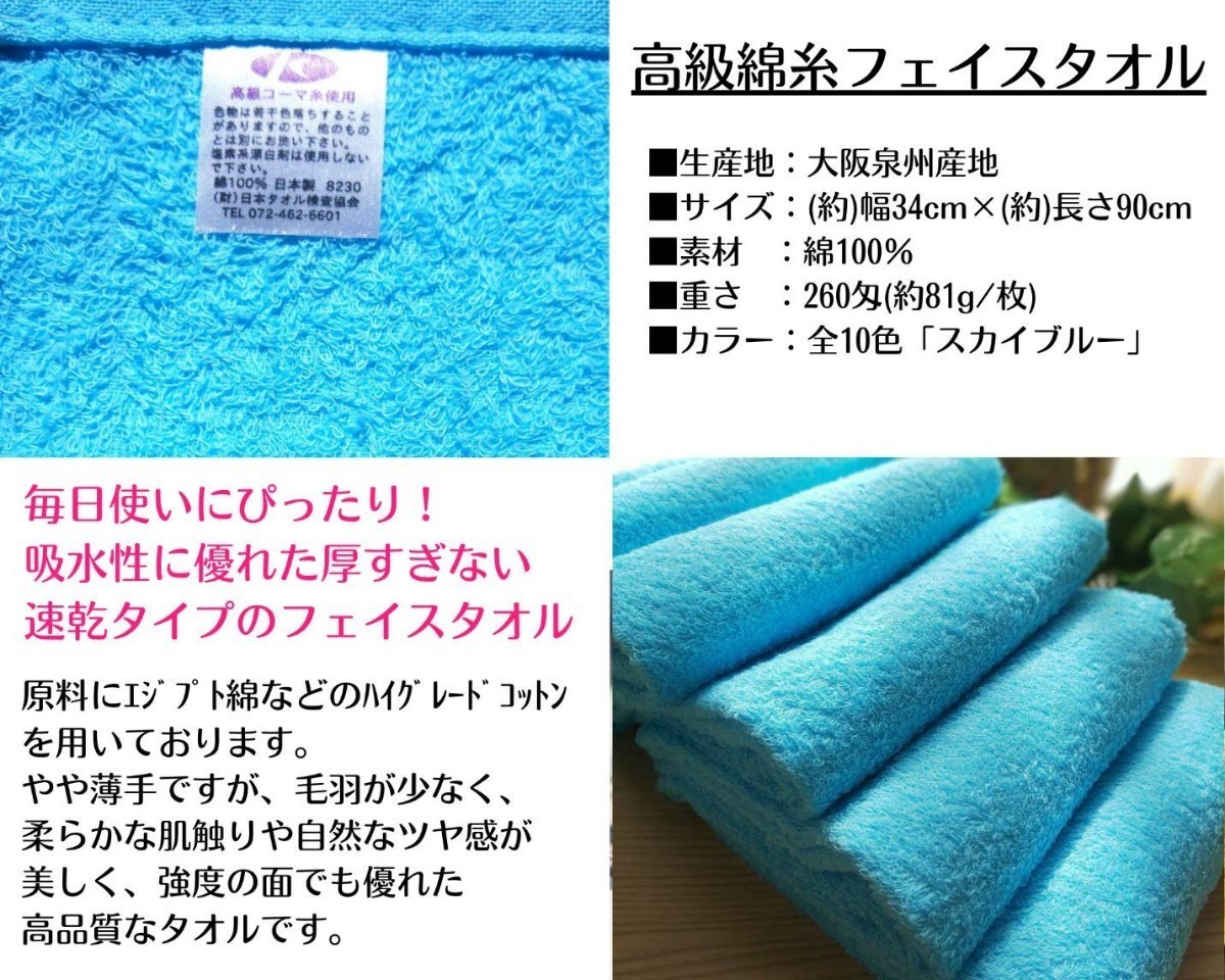 「新品未使用」「泉州タオル」260匁高級綿糸スカイブルーフェイスタオルセット5枚 タオル新品 優しい肌触り 吸水性抜群 タオルまとめ