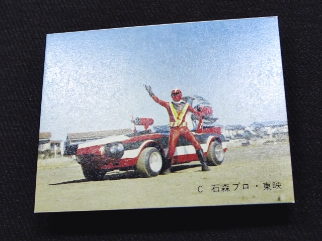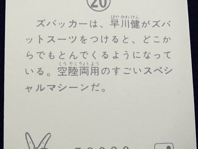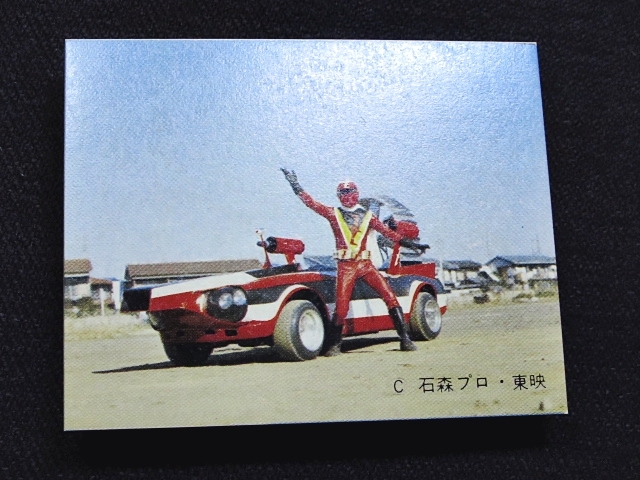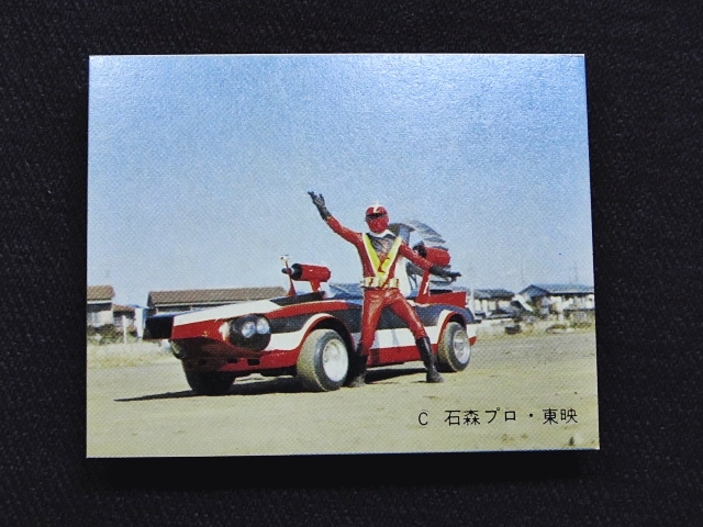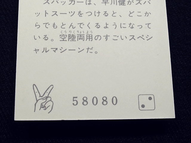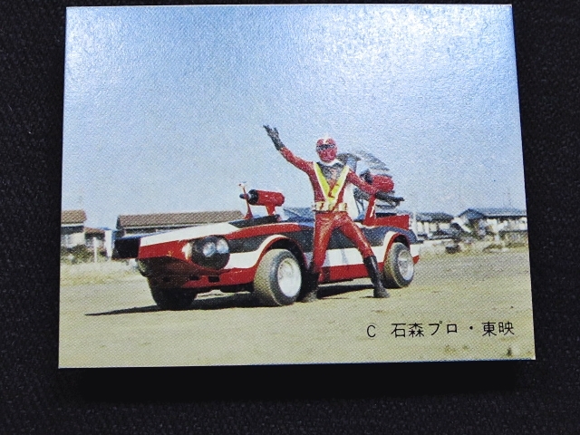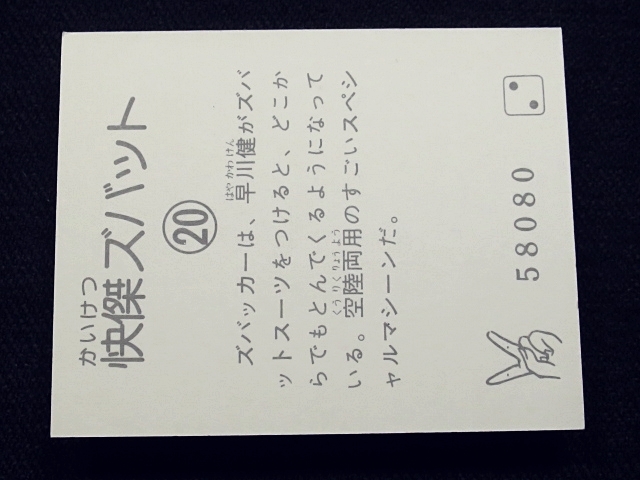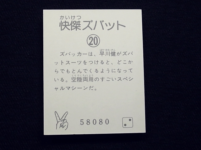 快傑ズバット ミニカード 70年代 バラ売り 1枚 ・メーカー:丸昌 ・サイズ: 6.6 cm x 5.2 cm ・発売時:1977年頃に駄菓子屋などにて発売。 ・構成:01-42(全42種)・アルバム3種シリーズ ・中古扱い ・同梱発送可能。(複数落札の場合:定形、定形外郵便は送料が変わる場合があります。) 〓参考項目〓 ・原作:石森章太郎 ・企画:平山亨 ・脚本:長坂秀佳、滝沢真里、田口成光 ・監督:田中秀夫、奥中惇夫、小西通雄、広田茂穂 ・放送期間:1977年2月2日 - 9月28日 ・放送回数:32回 〓出演〓 ・早川健・快傑ズバット(声):宮内洋 ・飛鳥みどり:大城信子 ・寺田オサム:中野宣之 ・東条進吾:斉藤真 ・首領L:はやみ竜次 ・ナレーター:青森伸 | ||