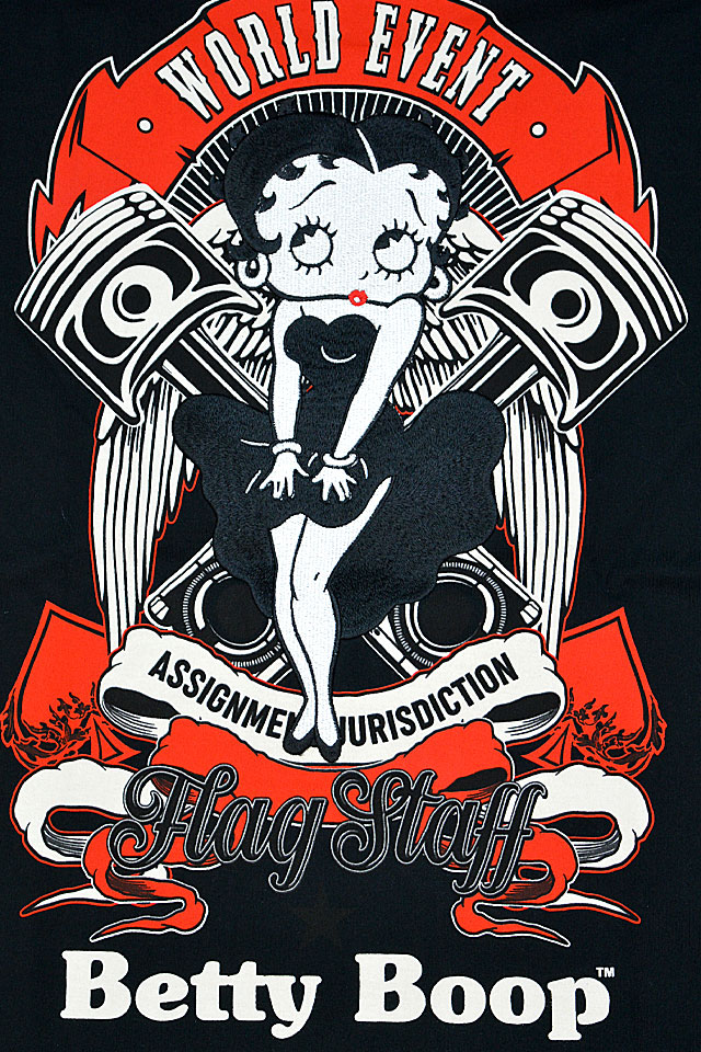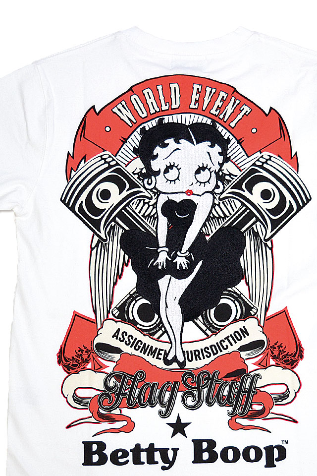 斬新なアイディアとインパクトのあるデザインが魅力的な、絡繰魂の姉妹ブランド【Flagstaff】より「Betty Boop×Flag Staff 半袖Tシャツ(432021)」のご紹介です。 大きな瞳とぽってりした赤い唇が印象的な女の子、ベティ・ブープ(Betty Boop)とコラボ! 背中にはベティの立ち姿をダイナミックに刺繍しました。 バックにしっかり柄を入れている分、フロントはシンプルにデザインし、メリハリを付けました。 アメカジ×ベティが絶妙に組み合わせられた、Flagstaff拘りの逸品です。 | ||||||||||||||||||||||||||