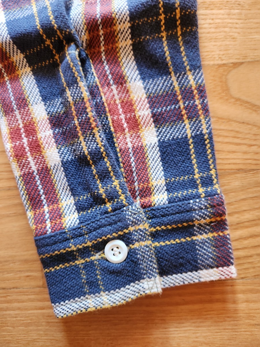 ◎特徴 ウエアハウスのネルシャツは、生地に日本では限られた地域にしか残っていない力織機を使用して生地を作っています。フランネルの生地を作るために力織機を使う理由は単なる「耳付きのネル生地」を作りたいという理由からではありません、あくまでもセルビッチは副産物なのです。その目的は、力織機を使用することでムラ糸の持つ風合いを損なうことなく、生地に仕上げることができるからです。デニムと同じで、ヴィンテージネルシャツの生地を織っていた糸は不均一なムラ糸であった時代です。その糸を革新織機で強いテンションをかけて織ると違う生地になってしまう。せっかくの糸本来の性質が損なわれてしまうのです。旧式の力織機で織る事で、糸本来が持つ凹凸を損なうことなく生地を織ることが出来ます。ネルシャツを織る力織機はデニムと同じ綾織りの織機です。ネルシャツは柄を構成する必要があるため、多色の糸を織れる仕組みになっています。タテ糸は柄に合わせて複雑に上下移動し、その間を違う色のヨコ糸を持ったシャトルが次々に入れ替わり往復に移動します。こうして力織機らしい適度なテンションで織られたフランネルは、それぞれの糸本来が持っているムラを損なうことなく生地となるのです。生地になったネル生地は、当時の製法に倣って生地の裏に起毛加工を施しています。起毛をかけることで柄に柔らかい表情が生まれます。さらに起毛をかけることで生地に膨らみを生み、力織機ならではの肌触りをさらに柔らかなものに昇華させることができます。このように、力織機で織られたネルは、糸そのものから再現することでこそ生まれる風合いを持っています。それを見分ける最も簡潔な方法がセルビッチ(耳)の有無であり、1960年代頃までのヴィンテージネルシャツと同じように、ウエアハウスでもマチ部分にセルビッチを使用しているのです。