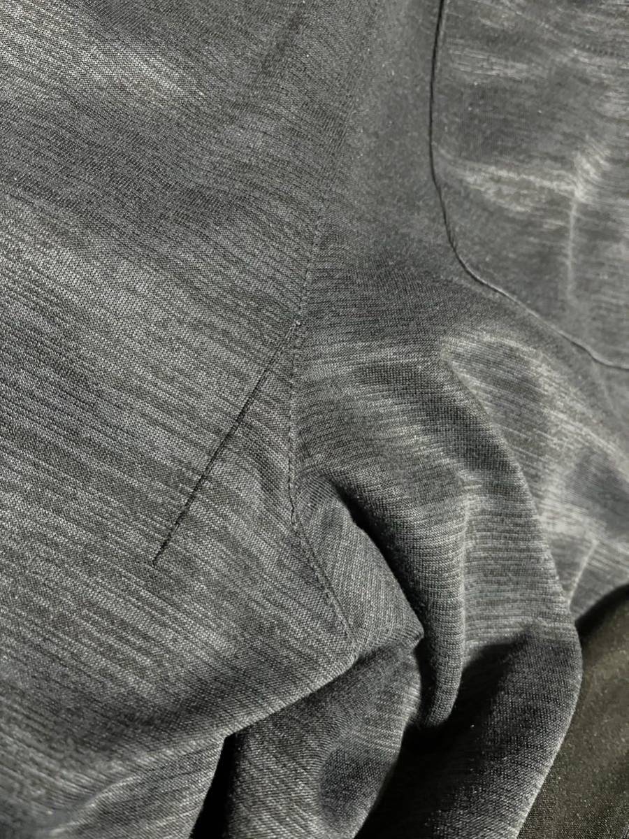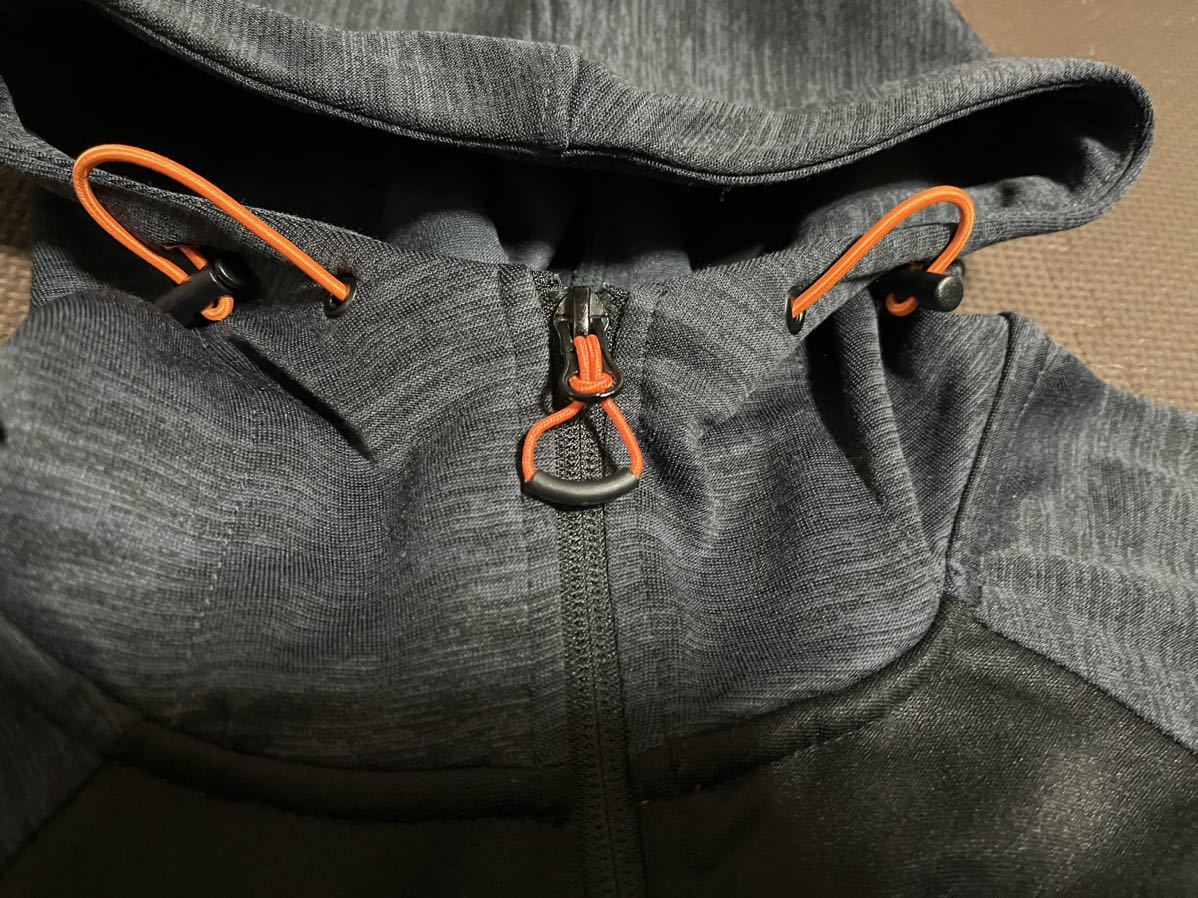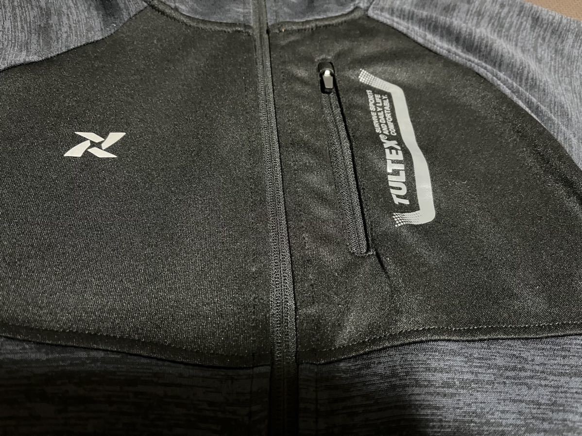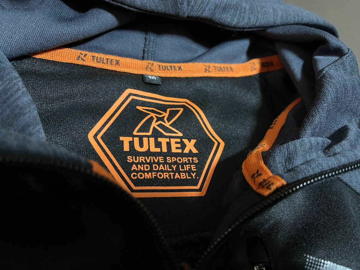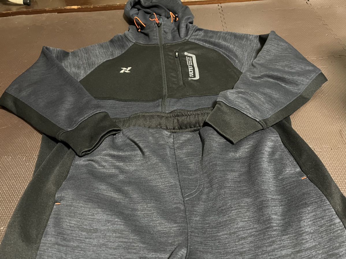 TULTEX胸ポケット黒、グレー柄入り、ロゴグレー、シルバー、ゴム紐蛍光色オレンジ、ストレッチ上下セット