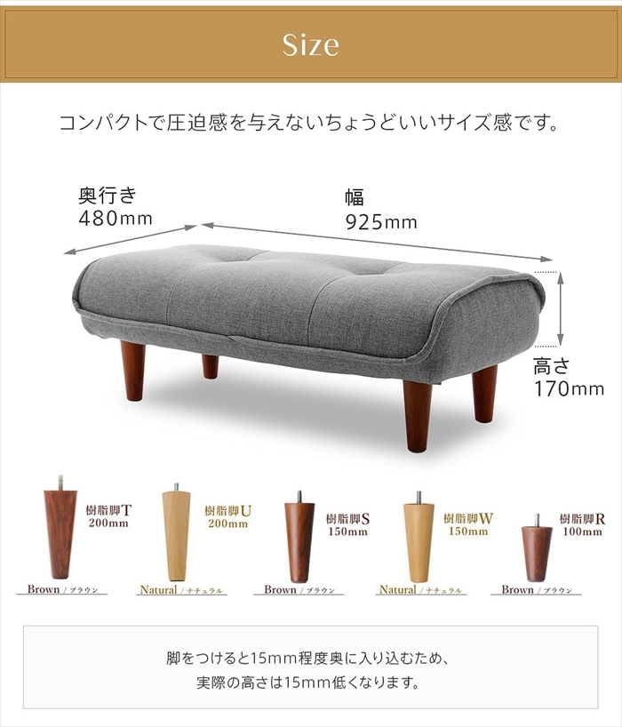 | [本体] 約幅925×奥行480×高さ170mm(脚を含まず) [脚のサイズ] 高さ100mmタイプ:約85mm 高さ150mmタイプ:約135mm 高さ200mmタイプ:約185mm ※木脚、樹脂脚ともに脚の高さが15mm程度奥に入るので, 取り付けた際に15mm入り込みます。 |