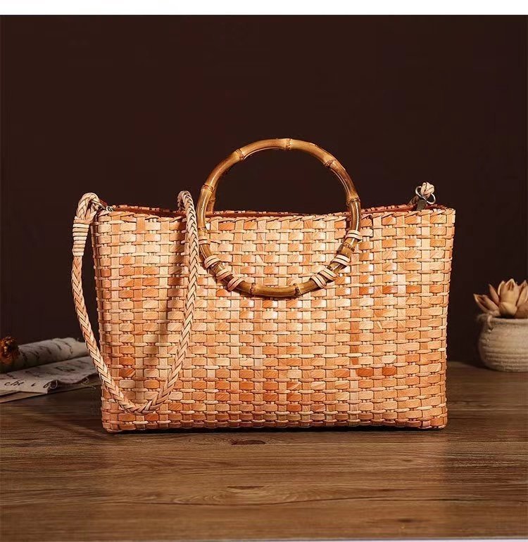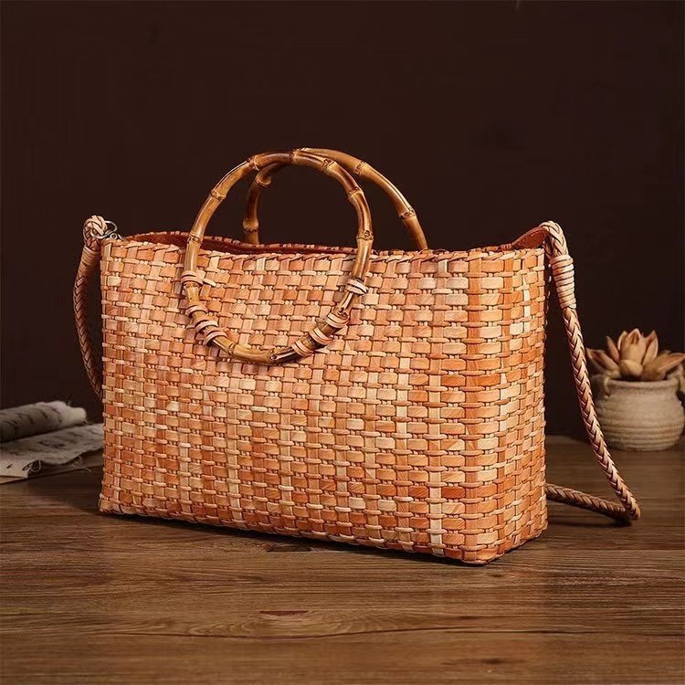 人気新品★ かごバック バスケット 籠バッグ 網代バッグ 天然素材 本革 牛革 トートバッグ 籠 バッグ ハンドメイド バンブーハンドル