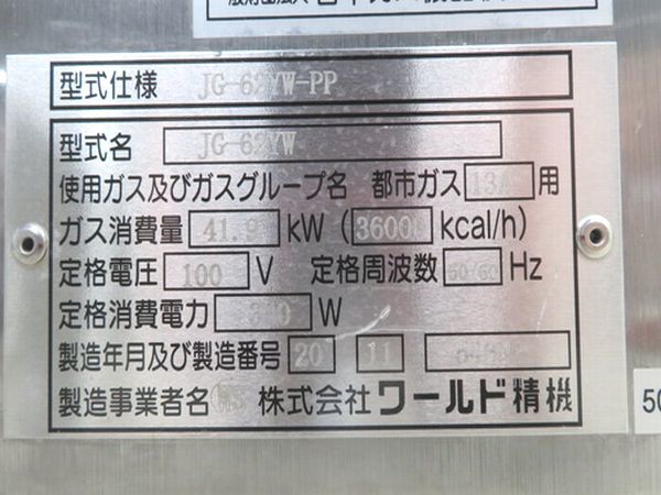 ◆ワールド 2020年◆ガスデッキオーブン JG62YW-PP 都市ガス/100V 1720×1655×1600 サイズ:W1720×D1655×H1600mm オーブン能力:天板(6取/フランセ)横6枚差2段 ガス種:都市ガス13A 41.9kw 電源:100V 付属品:取扱説明書・フランスパンスコップ・引っ掛け棒 製品質量:1080kg 備考:オーブン内の食パン型枠ラックは、取り外し可能です。 出品にあたり動作確認・クリーニング済みです。 多少の傷・使用感等がありますので、予めご了承ください。 中古品ですので、画像をよくご確認の上、ご理解頂ける方のご入札をお願いいたします。 神経質な方はご入札をご遠慮ください。 気持ちの良いお取り引きにしたいと思いますので、ご不明な点等ございましたらお気軽にご質問ください。 | |