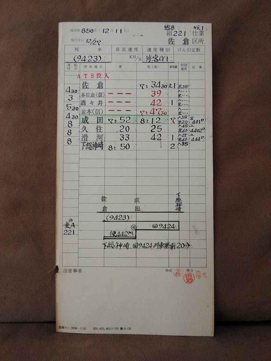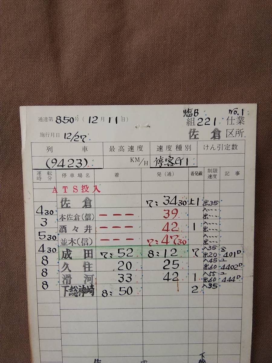運転士時刻表 スタフ 佐倉区所 臨B組第221仕業 9423レ 佐倉-下総神崎 DD51牽引 列車 佐倉機関区