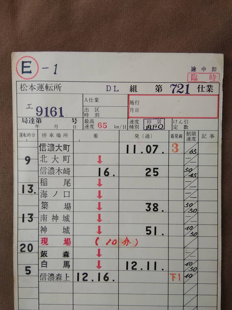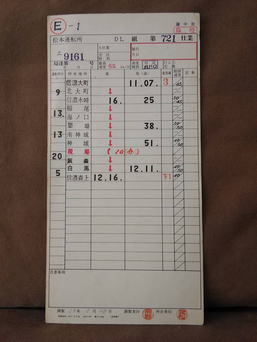運転士時刻表 スタフ 松本運転所 DL第721仕業 工9161レ 信濃大町-信濃森上  DE10 大糸線 国鉄 日本国有鉄道