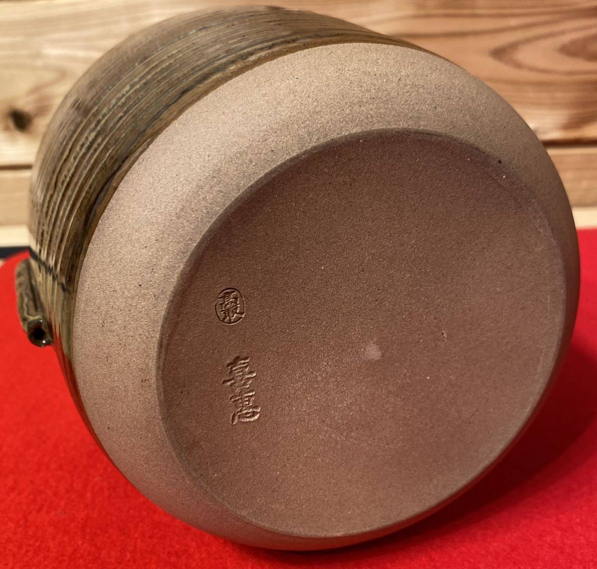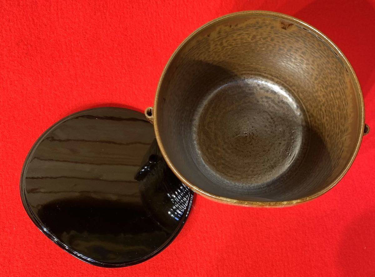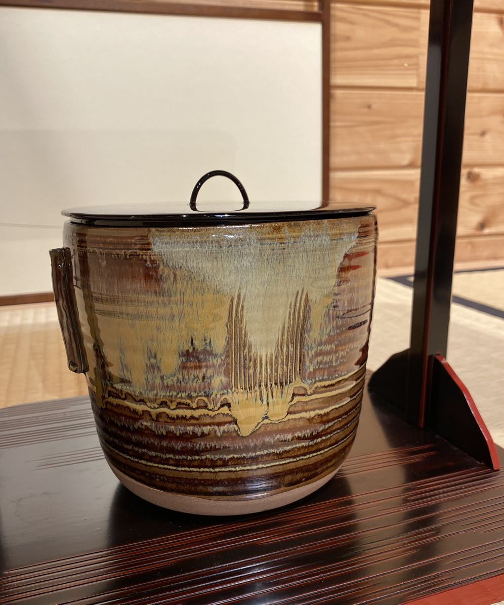 侘び寂びの陶器「高取焼」の水指です。前押の形状にぴったりと合わせて作られた、塗蓋付きです。