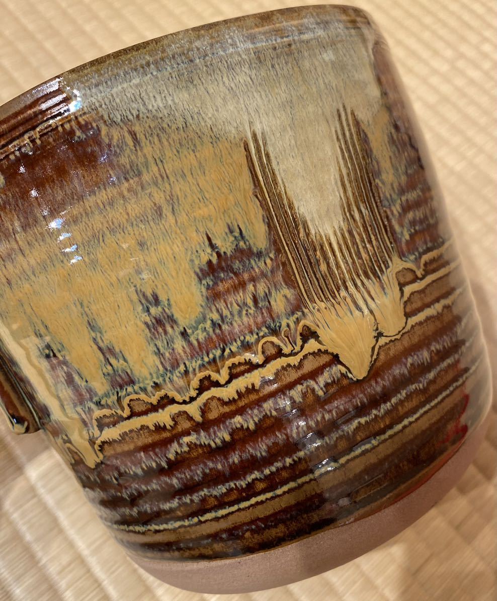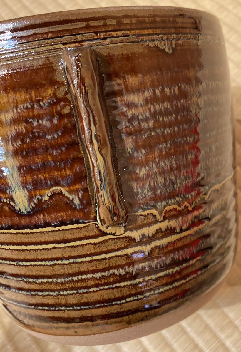 高取焼は赤白の2種類の土を使い7色(白・飴・黒・黄・高宮・フラシ・緑青)の釉を特色とする「高取焼釉」が茶人の心をとらえており、その中でも茶褐色釉にまだらに乳白釉をかけるのが特徴的です。