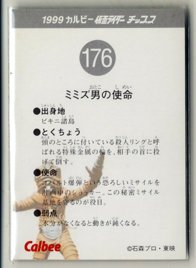 | ◆防水対策 厚紙補強 カルビー 仮面ライダーチップスカード(1999 復刻版) 176番 ミミズ男の使命 トレカ 即決 | |