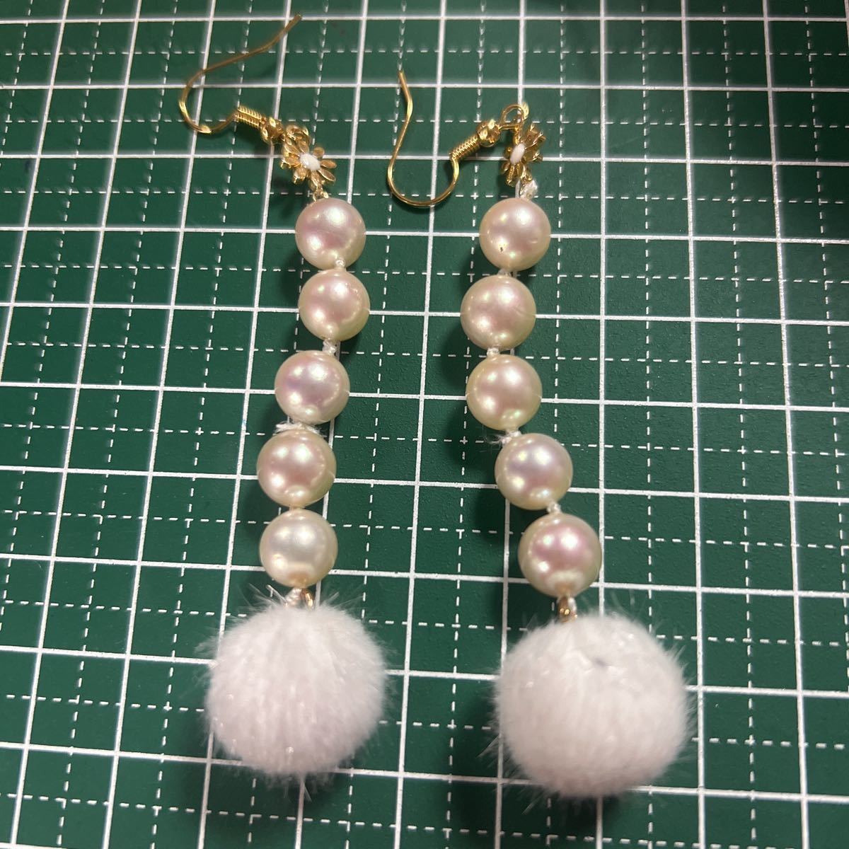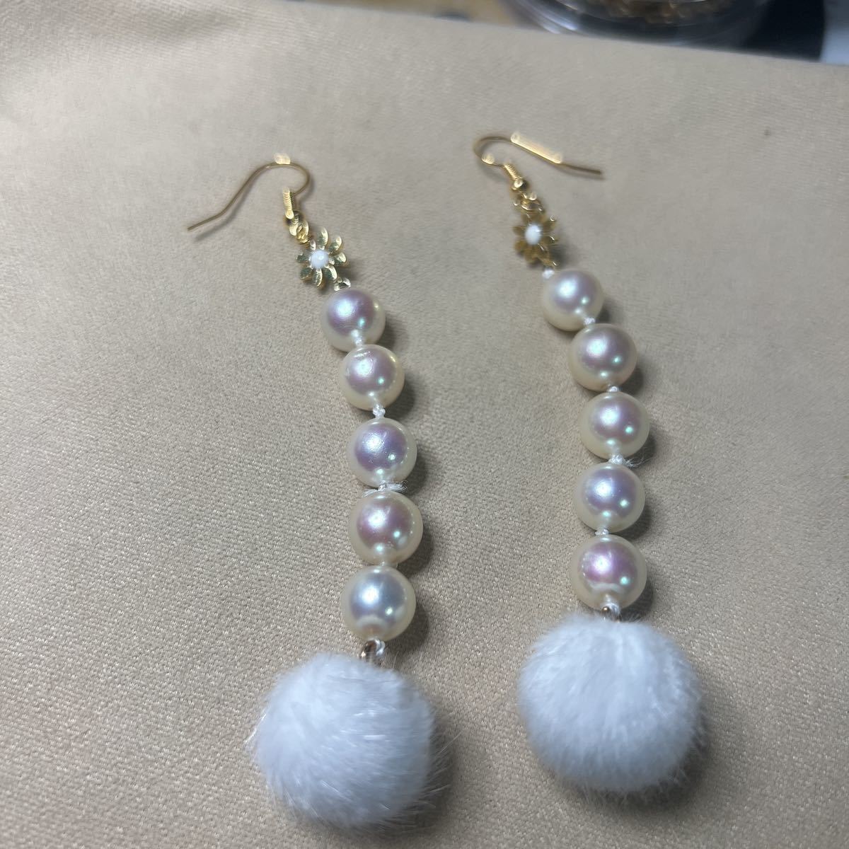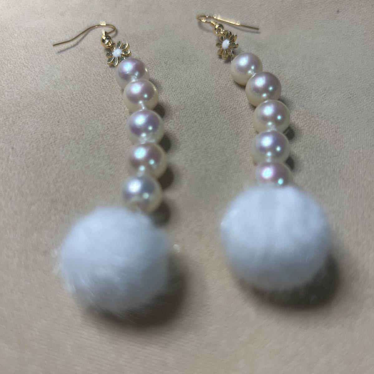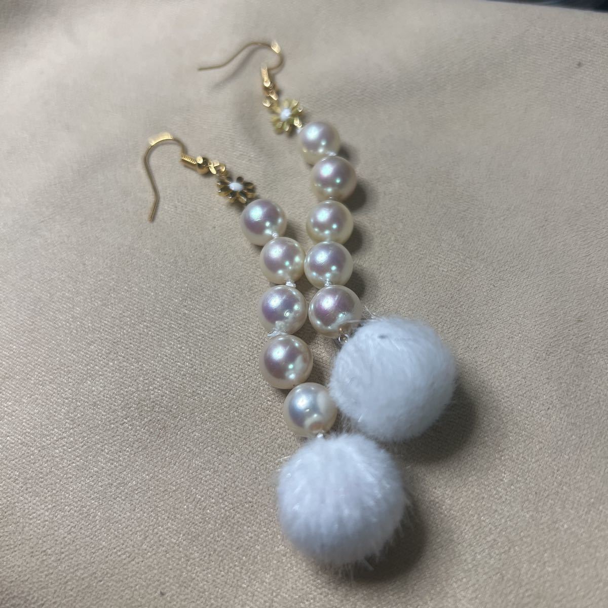 上質の貝パールにファーボールをつけました。とても可愛いです。貝パールは糸で繋いでるので結び目等目立つ箇所あります、画像でもわかる通り貝パールは天然ならではのへこみキズ等ございます。