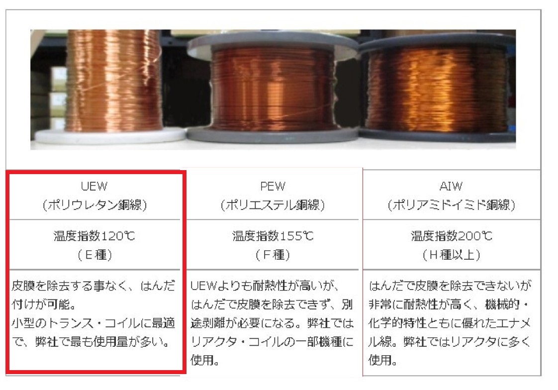 温度指数120℃(E種)で耐熱温度が低いので皮膜を除去する事なく、はんだ付けが可能。