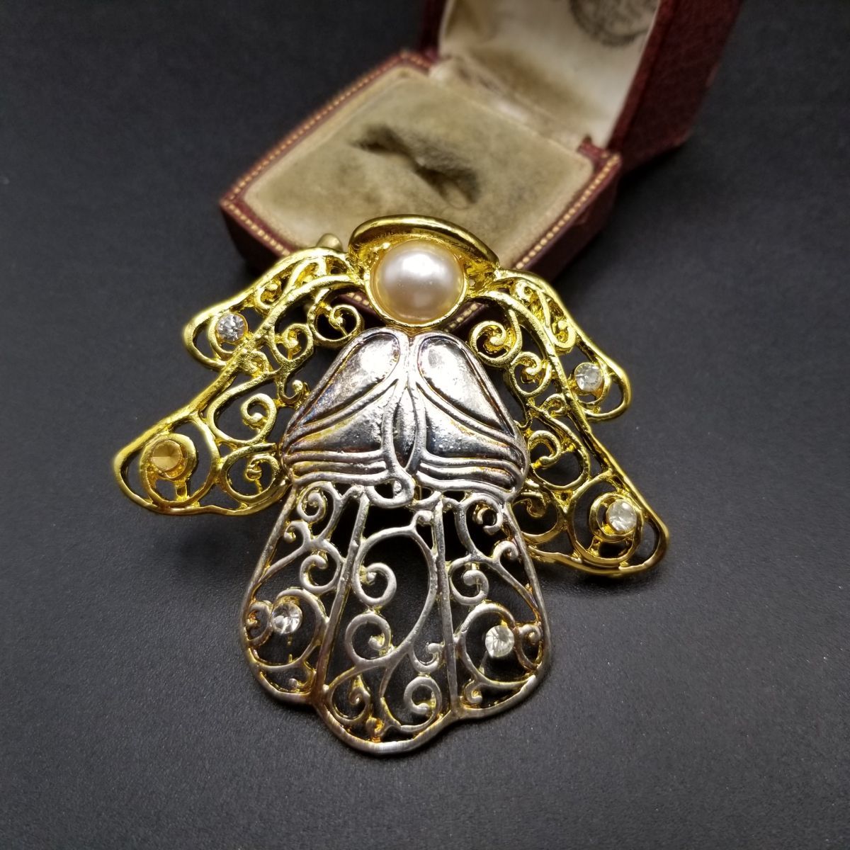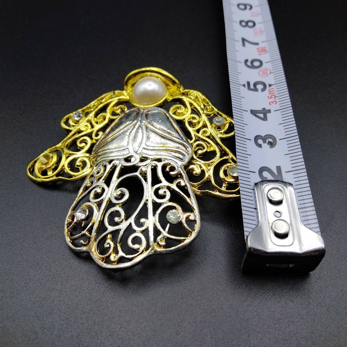 天使 エンジェル モチーフ オープンワーク フェイク パール ストーン 透かし 大ぶり ヴィンテージ ブローチ ジュエリー 輸入 Y9-A