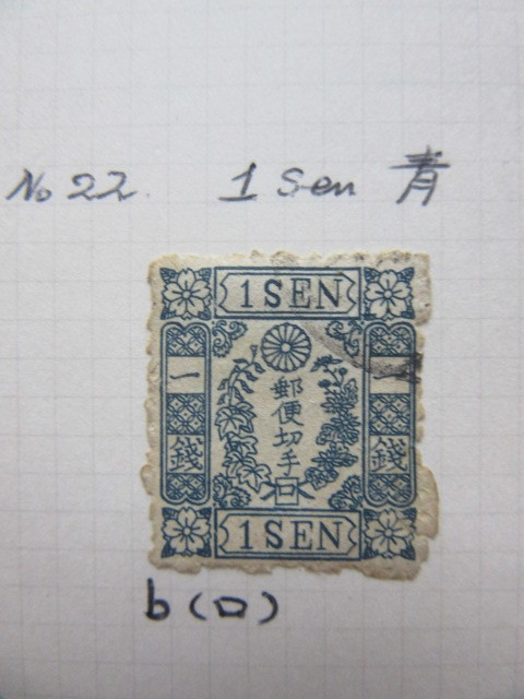 手彫切手 桜洋紙カナ入り 1銭(ロ)(未使用、1874年)