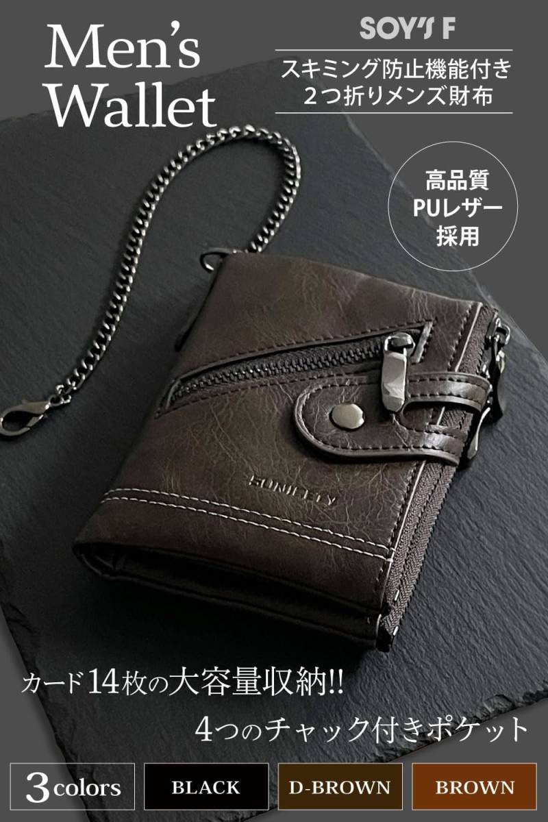 カード14枚収納縦長二つ折り財布 ダークブラウン 小銭入れ カード入れ お札入れ チェーン付 大人感 一粒万倍日 お洒落 高級 PUレザー 財布