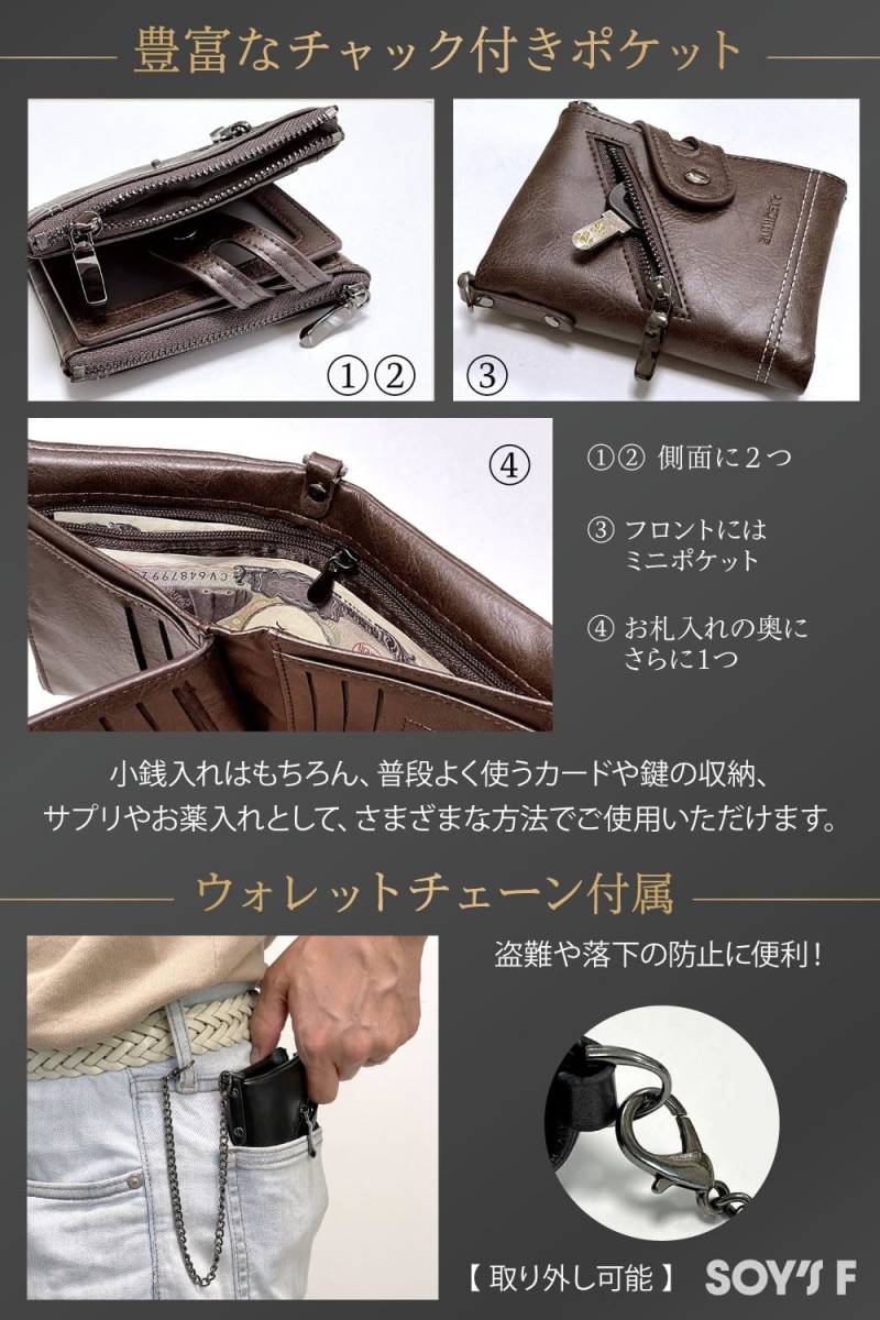 さらに、取り外し可能なウォレットチェーンも付属しており、盗難や財布の落下を防ぐためのセキュリティを提供します。